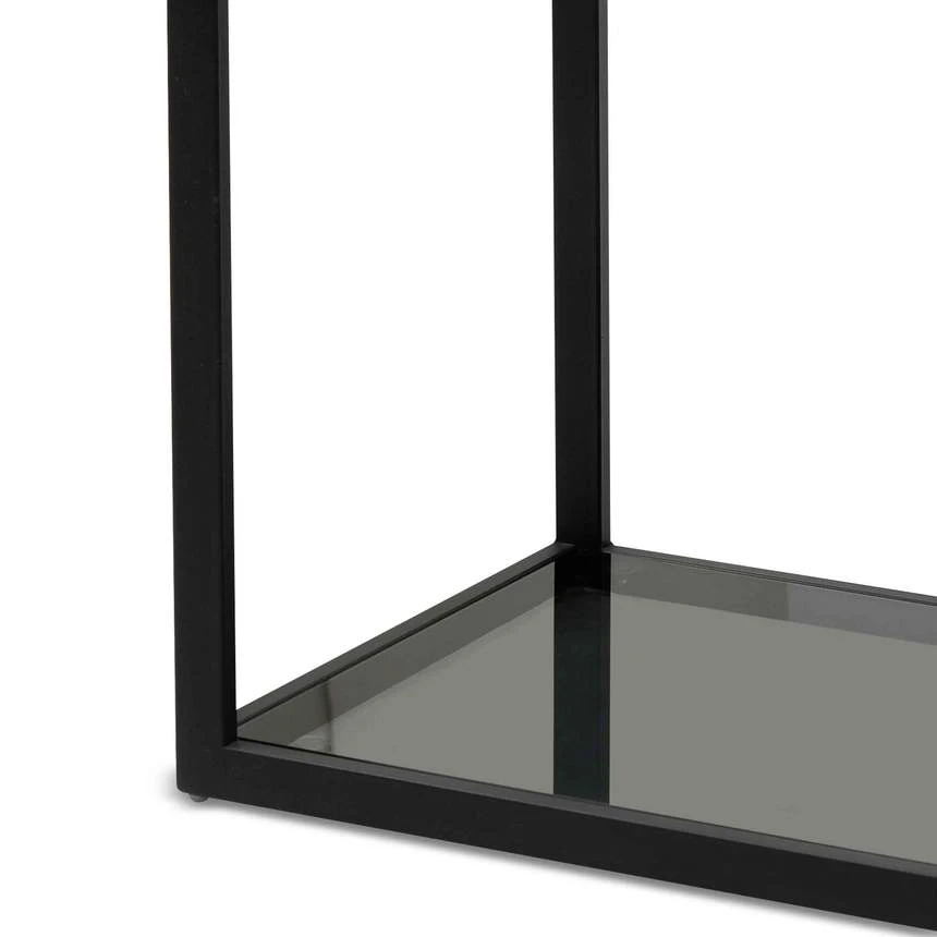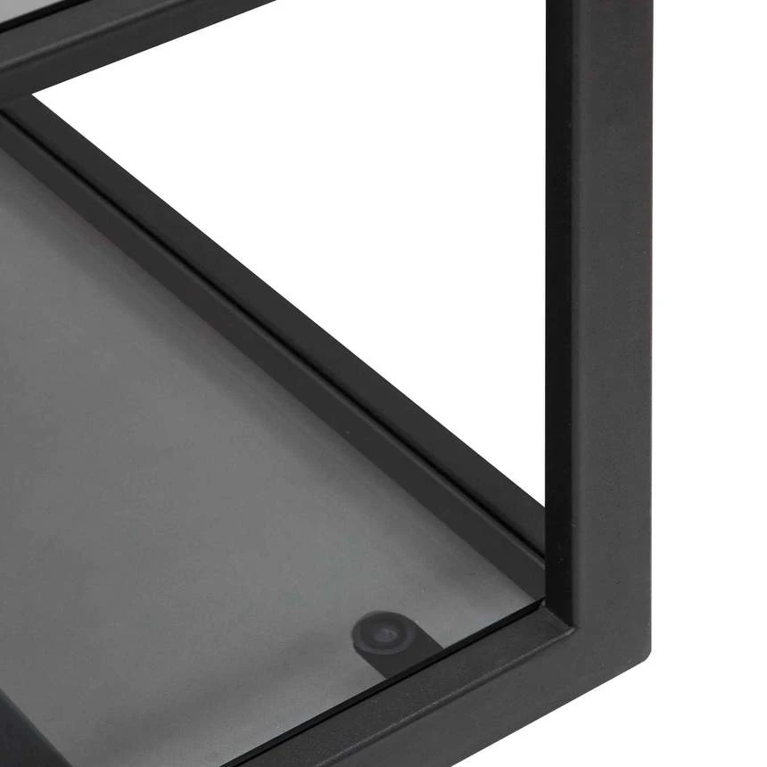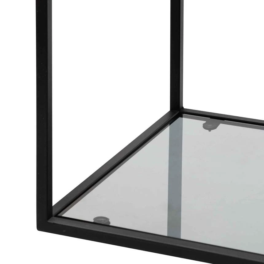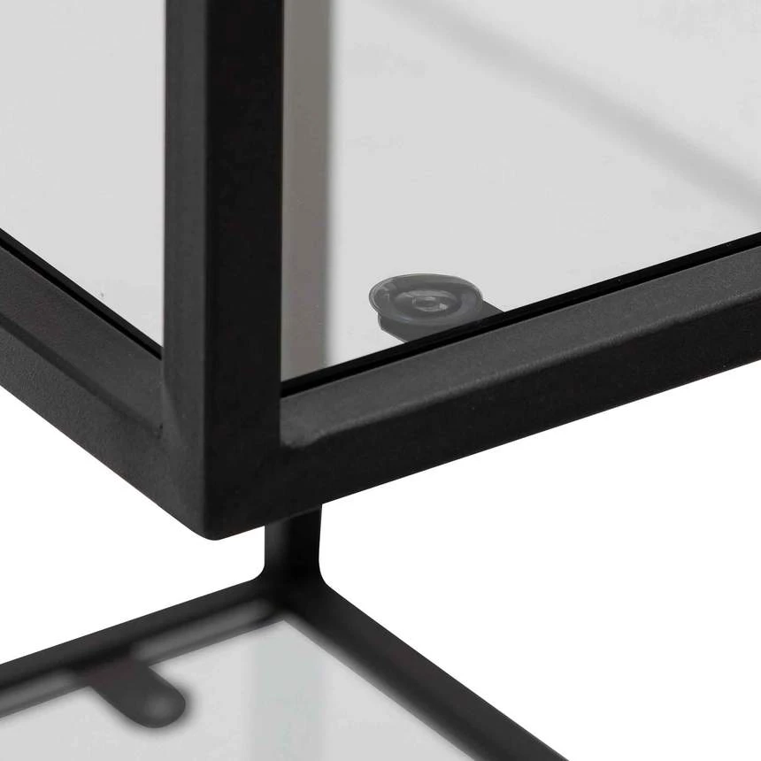Steel frame in a powder black finish Clear tempered glass shelves with a tinted exterior Multiple shelving for convenient display or storage space Asymmetrical and alternating design gives off the appearance of floating shelves Suction cups included to secure the glass tops to the frame Tall, wide, and narrow design to fit any space Product comes fully assembled