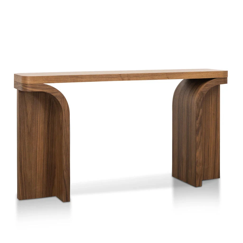 Engineered wood with veneer Rectangular table top with rounded corners 2x curved legs with floor protectors Walnut veneer finish with visible wood grains Weight capacity: 60 kg Product requires minor assembly