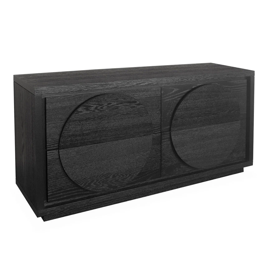 Engineered wood with oak veneer Textured espresso black finish NC Lacquer coating Bold circular patterns Ample storage space Natural wood grain and texture Perfect for contemporary interiors Product comes fully assembled