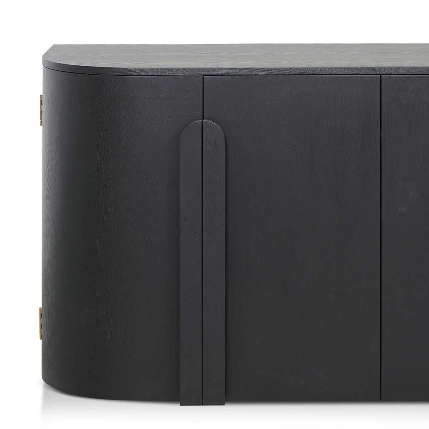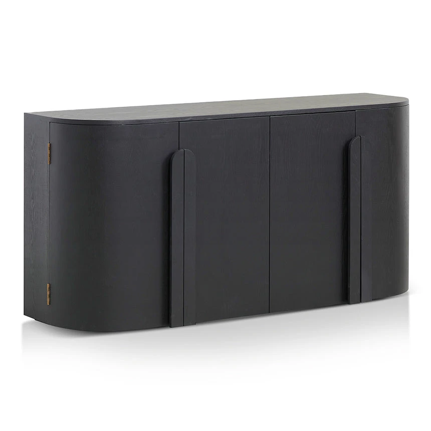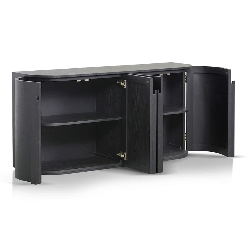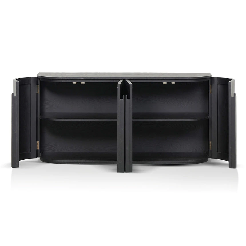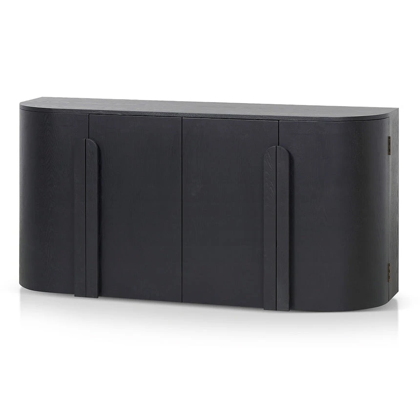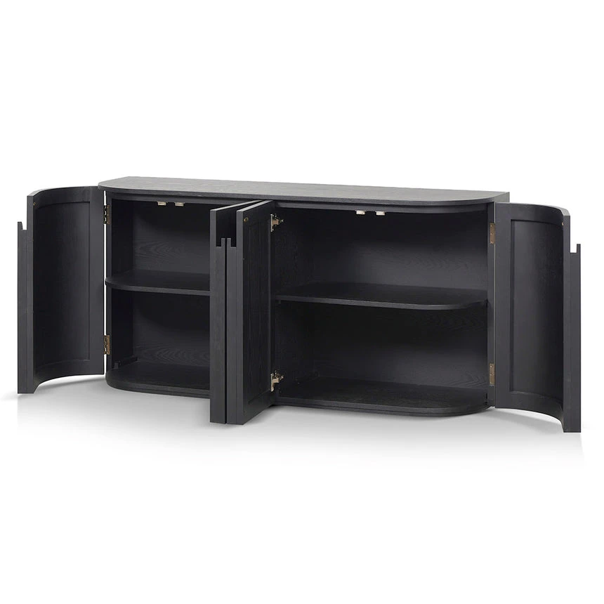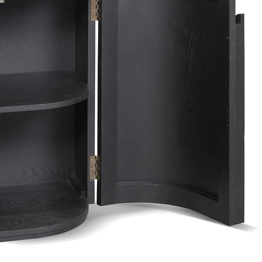 Ash veneer with solid wood handles Rectangular shape with rounded corners Full black matte finish 4x doors with 2 double shelves Push-to-open doors Solid flat base for stability Weight Capacity: 100 kg Fully assembled