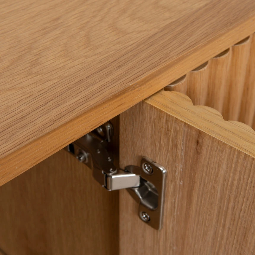 Engineered wood with oak veneer Natural finish with NC coating Vertical wood panel design Oval top shape 2 handleless cabinet doors Push-to-open mechanism Spacious storage compartments Solid oak wood legs Weight Capacity: 100 kg Required two person assembly