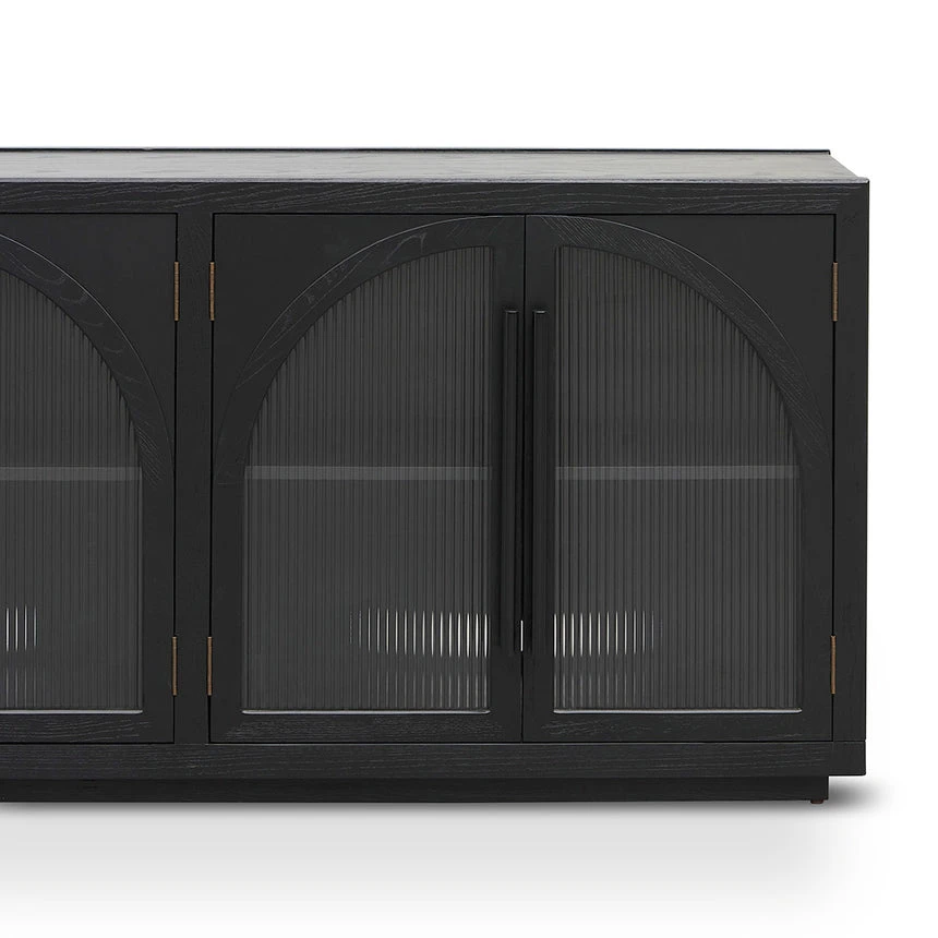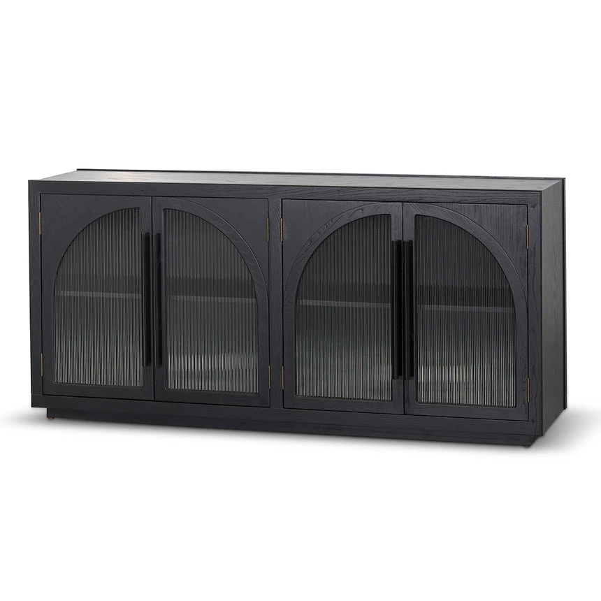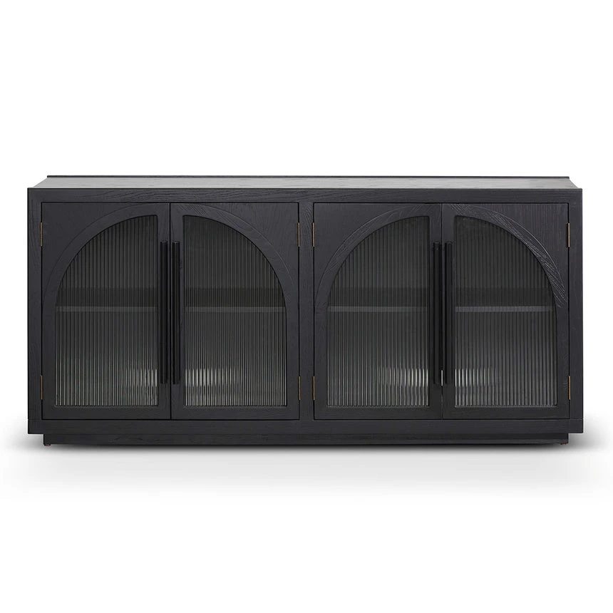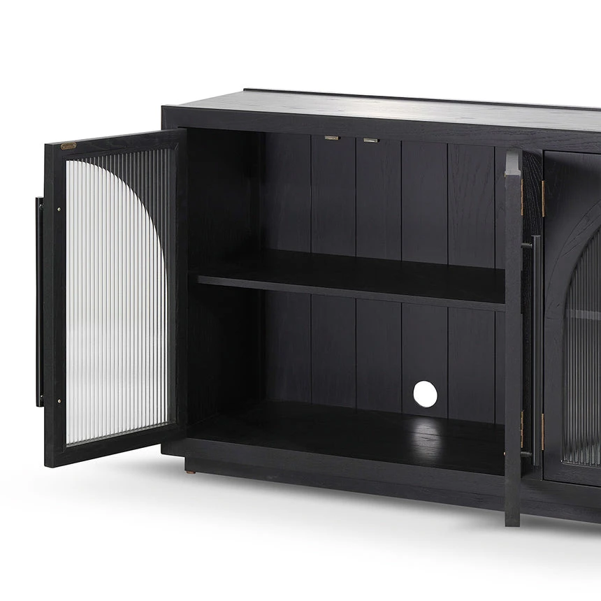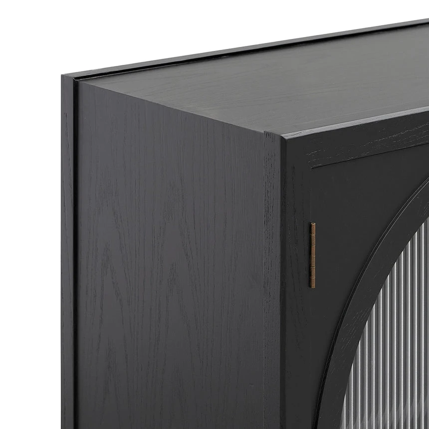 Solid oak wood in matte black finish Half-arch door with tempered glass and plywood veneer Stable flat base Double shelves in both partitions Black handles and magnetic latch Weight capacity: Top 100 kg Shelves 20 kg Product comes fully assembled