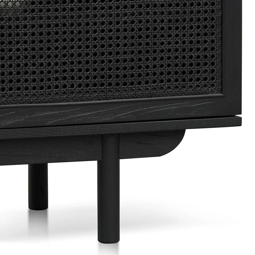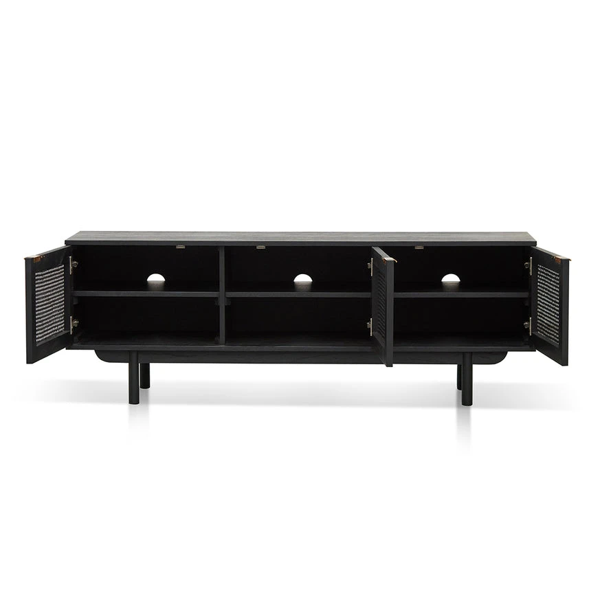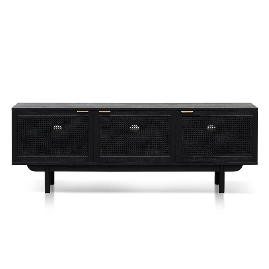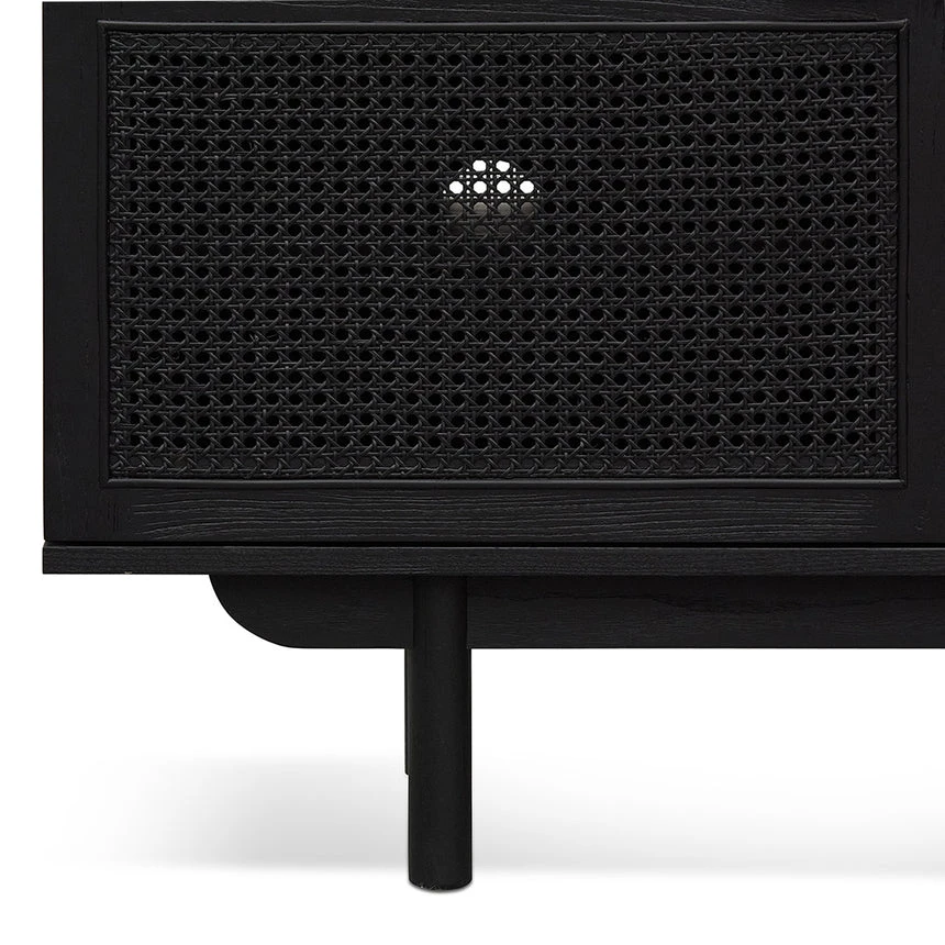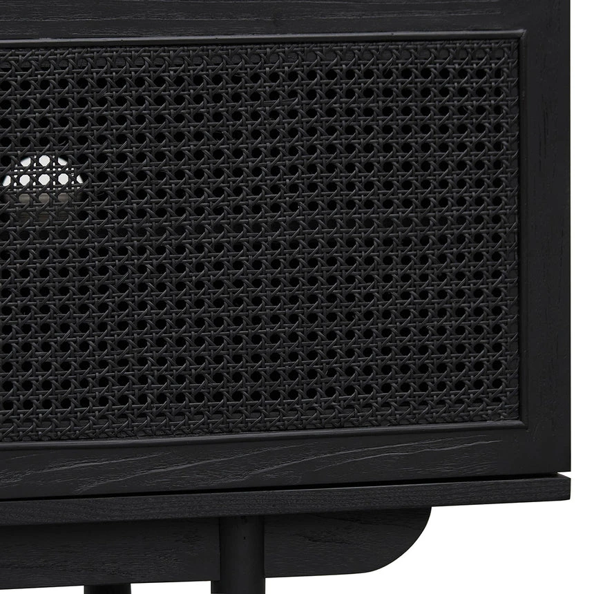 Made of New Elm wood finished in matte black 3x Rattan woven doors with Brass brushed handles 3x compartments composed of 2x shelves each 3x hole cutouts for cord management 4x round legs equipped with non-slip floor protectors Distributed weight limit of 150kg Product is fully assembled