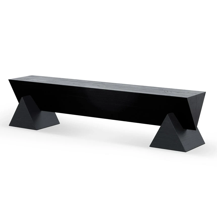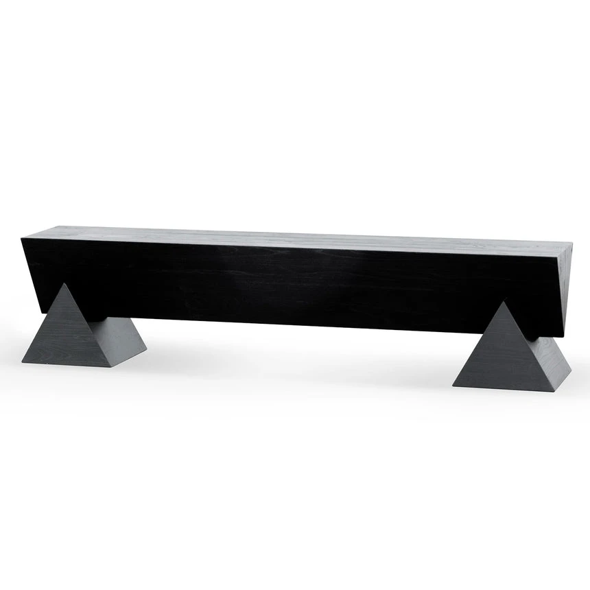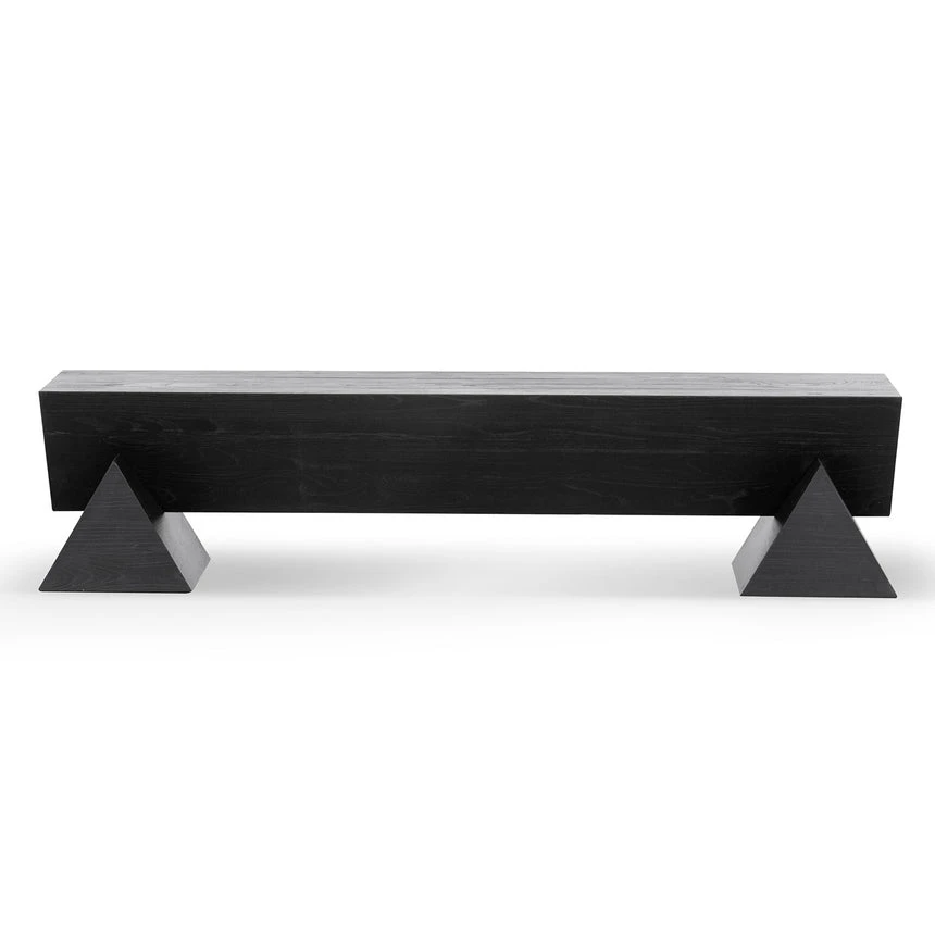 Complete new elm wood construction All black colour palette with deep wood patterns throughout Tapered bench design intersects with pyramid-shaped base Product comes fully assembled