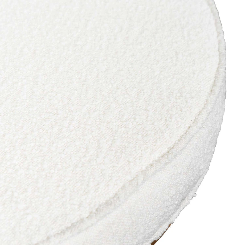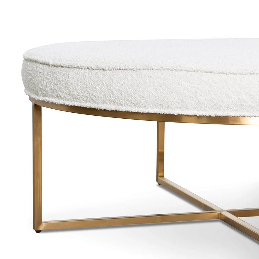 Upholstered in 100% white polyester boucle fabric Internal eucalyptus timber build Frame in a brushed gold metal construction X-cross base design Product comes fully assembled Discover the luxurious comfort of upholstered seating . Our collection offers a variety of upholstered ottomans that add a touch of elegance to your home.