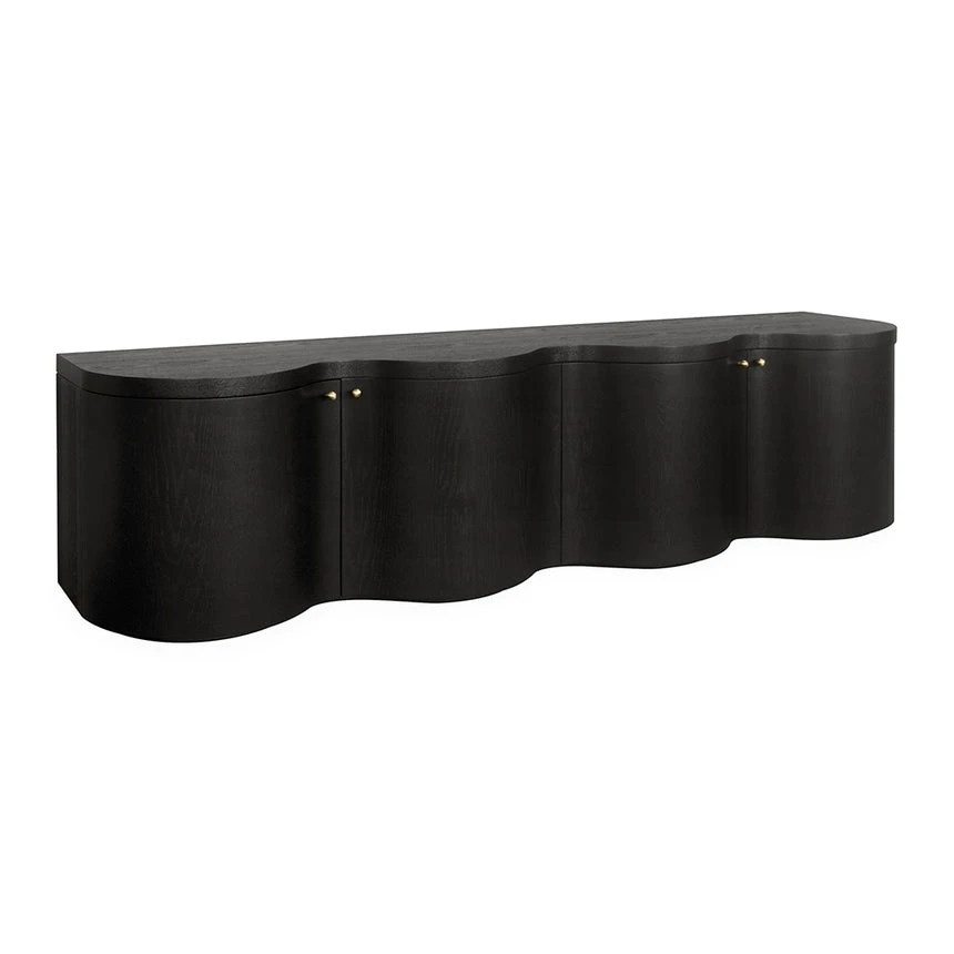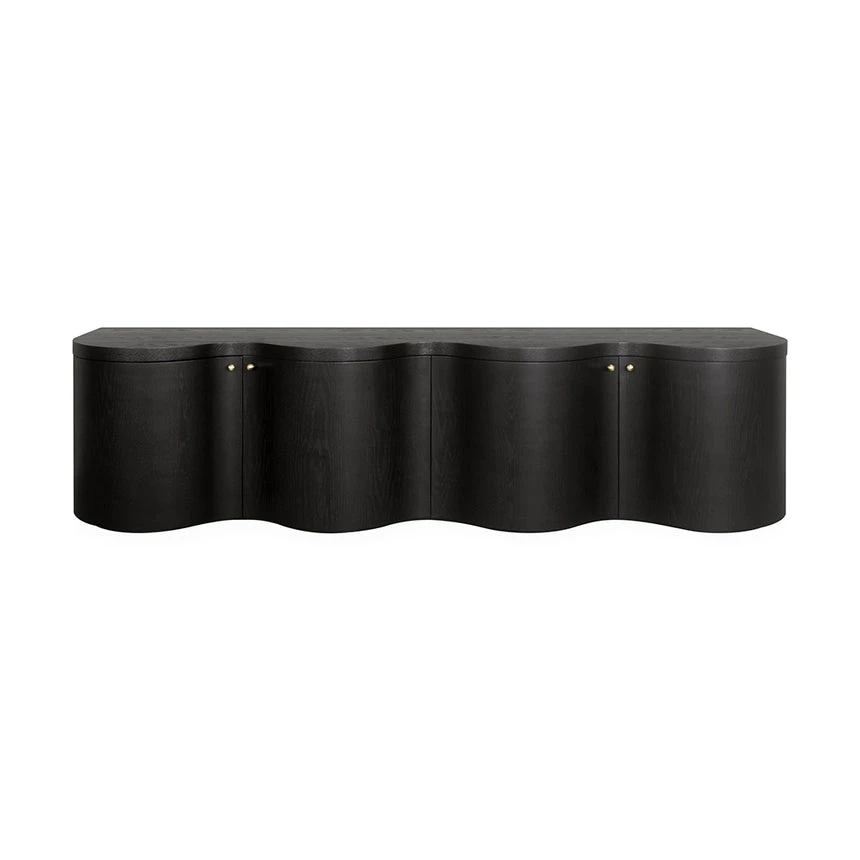 Engineered wood with walnut veneer Textured Espresso Black finish Brass cabinet handles 4x cabinets Wave zigzag curved design Prominent wood grain patterns Modern design Product comes fully assembled