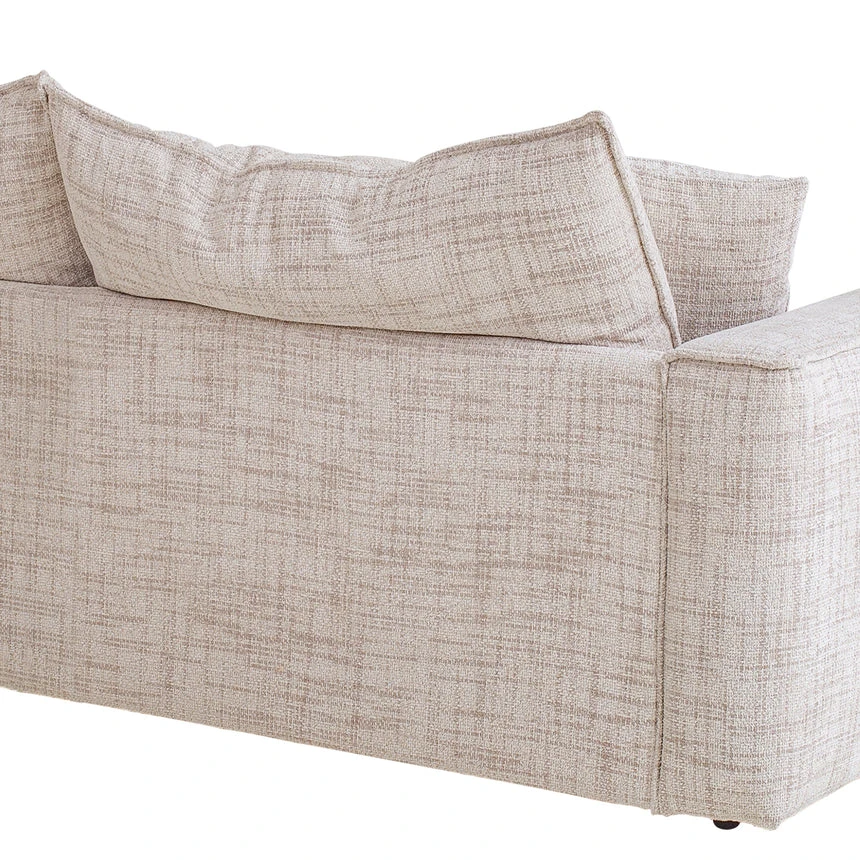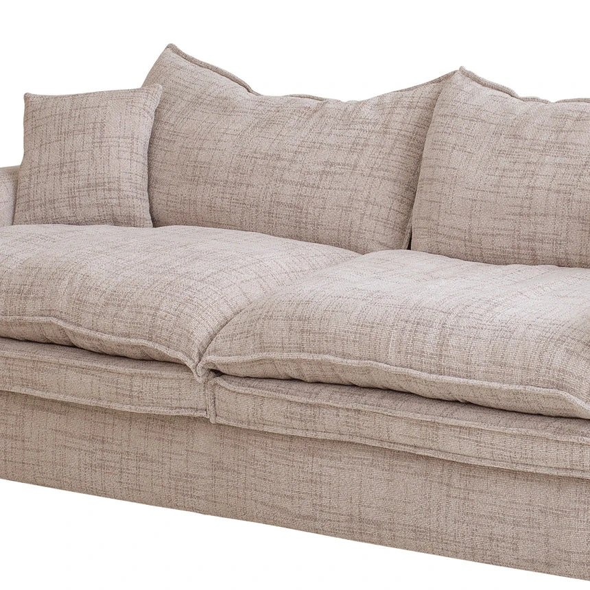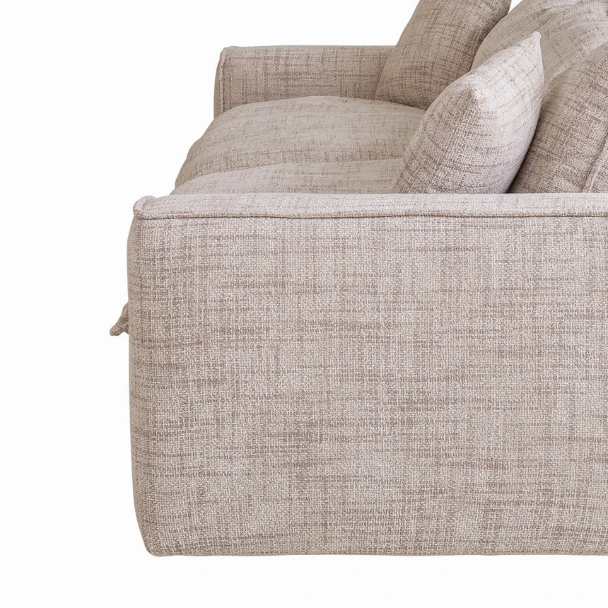 Cream polyester fabric upholstery Cushions filled with 30kg/m³ foam, feathers, and fibers Plywood and solid wood construction Soft-medium seat firmness Sophisticated design Deep seats and overstuffed cushions Soft lines and substantial armrests Weight Capacity: 200 kg Product comes fully assembled