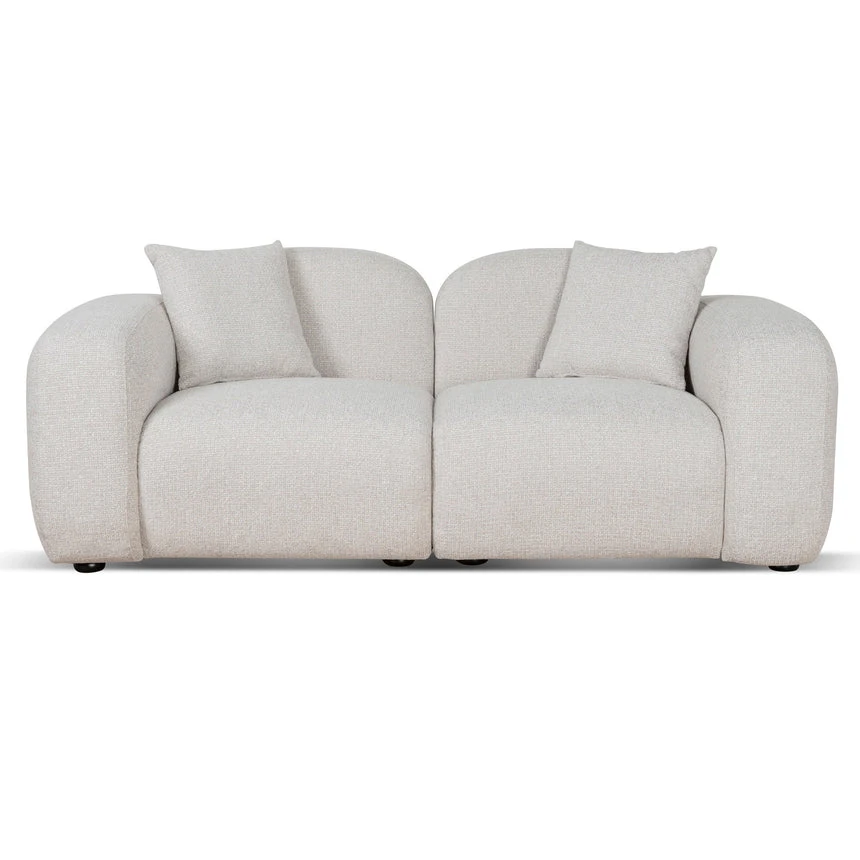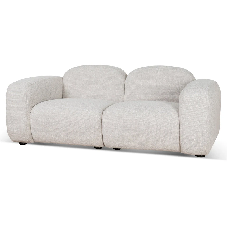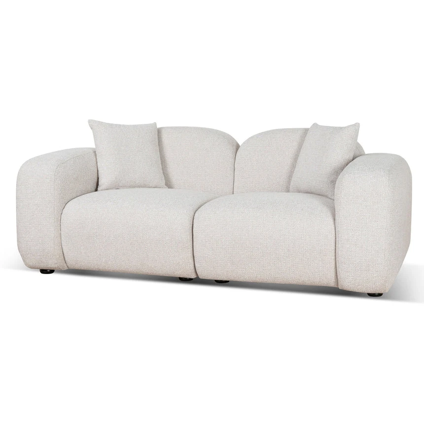 Stone Beige polyester upholstery Wood frame with plywood construction Spring suspension Soft seat with foam filling Rubberwood timber legs Rounded design with curved armrests Distributed weight capacity of up to: 200 kg Assembly Information: Please note that the feet of the sofa should be positioned in the desired location, ensuring the screws are secured within the corner wooden frame. There are no pre-marked spots for the feet, allowing flexibility in alignment and visibility of the feet for aesthetic preferences. An electric drill is required to secure the screws into the feet for proper assembly. The sofa does not require the connectors for regular use, but they are supplied as an optional feature. If you wish to lock the two sofa sections in place, position the sections together and drill in the connectors along the edge of the base frame, following the indicated line.
