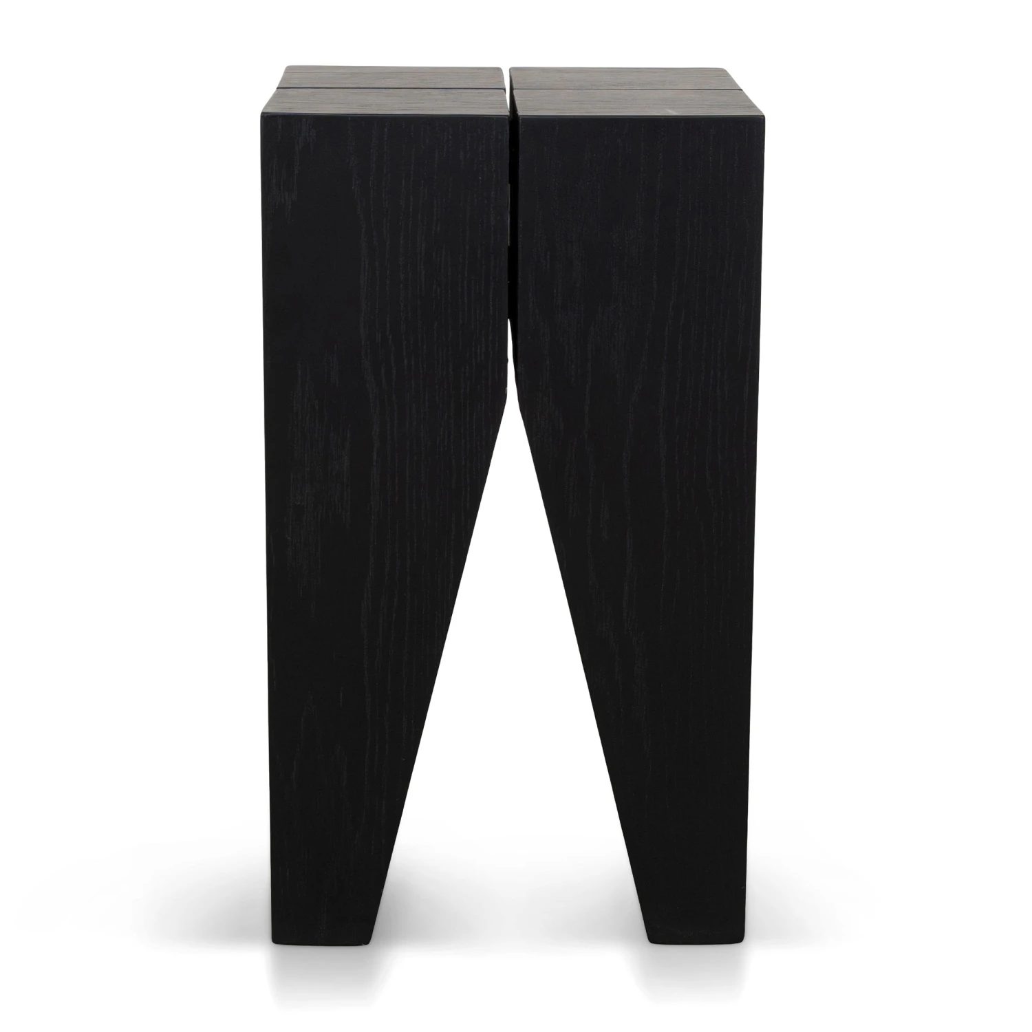 Solid oak wood construction Four sculptural blocks Bold angular legs Compact and versatile design Full black tone Tactile wood grain patterns Weight Capacity: 150 kg Product comes fully assembled