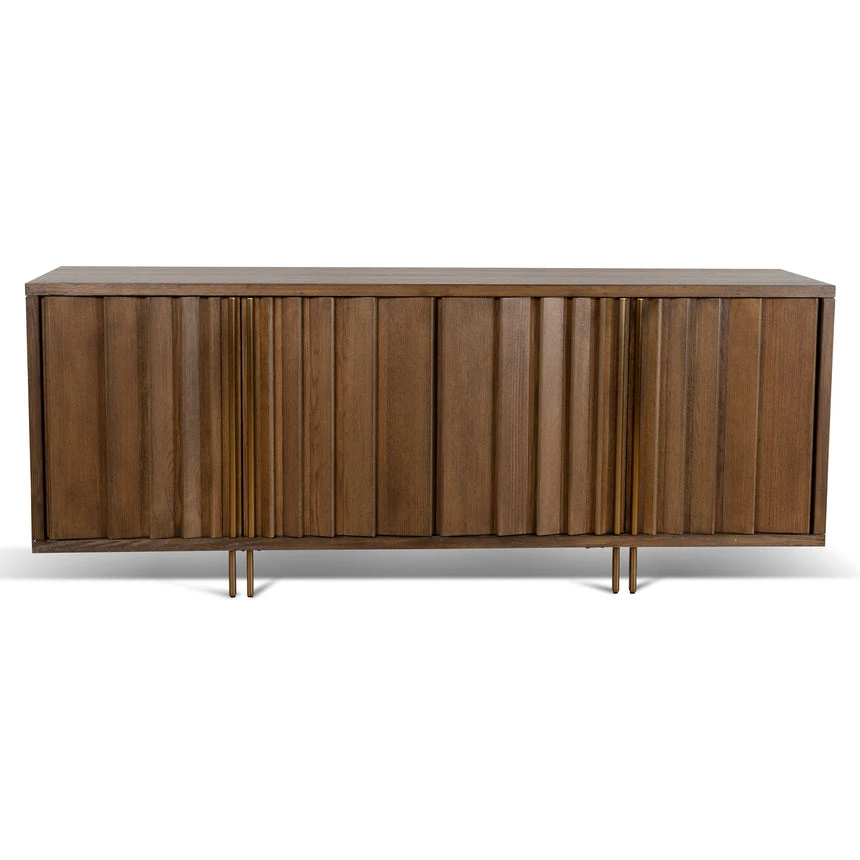 Engineered wood with oak veneer Caramel Oak finish Wood lining accentuates front doors Wood grain patterns Bronze metal door handle and legs Spacious top for versatile display Pull-to-open mechanism Ample storage compartments Product comes fully assembled