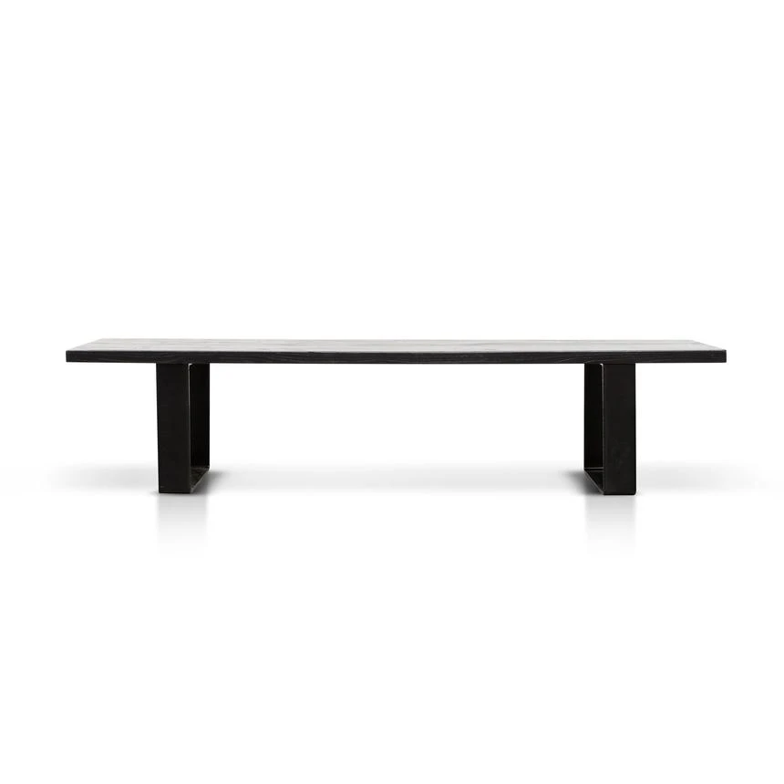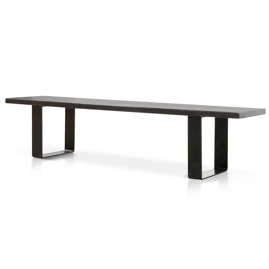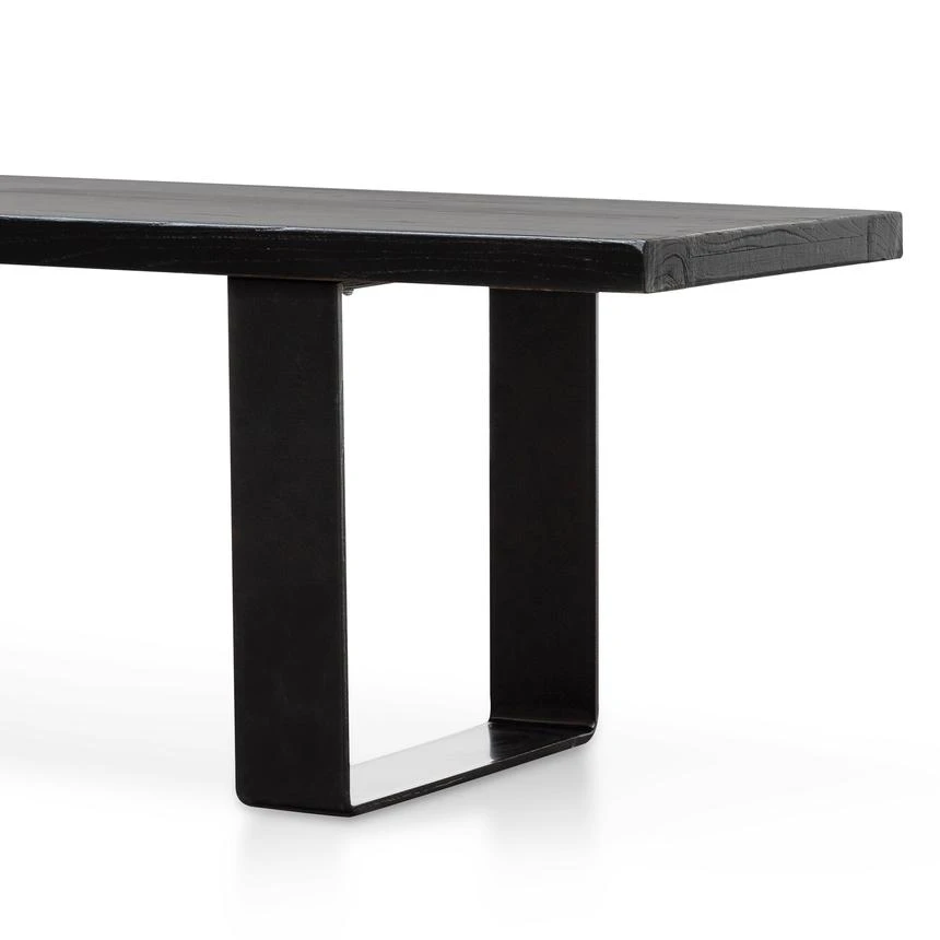 Re-engineered elm wood table top Metal loop legs in powder black Untreated natural finish Seats 4-6 people Product requires two-person assembly and furniture assembly experience Note: The timber used in this range is recycled elm timber. The tables are handmade and have been prepared to give the table top a unique finish. The table will naturally have distinctive characteristics such as cracks, splits and imperfections, which are then filled and evened out using square timber fillings where required for single piece table tops. The raw and rustic features should be appreciated as part of the look and are not manufacturing defects.