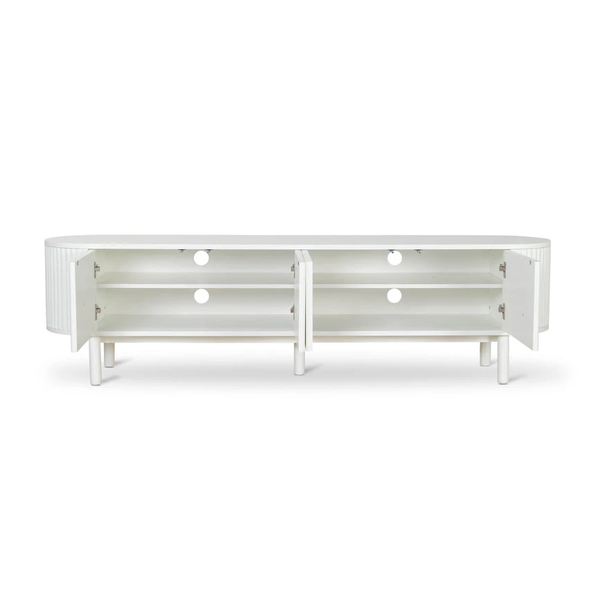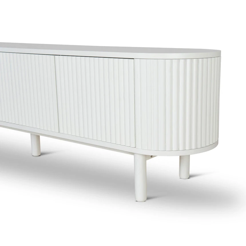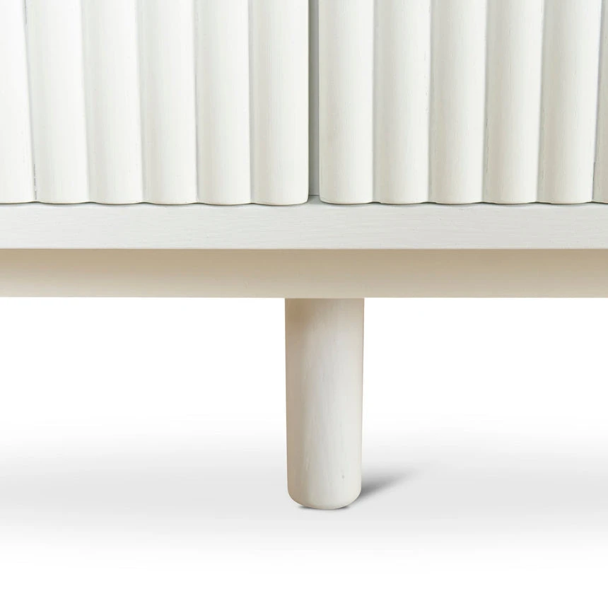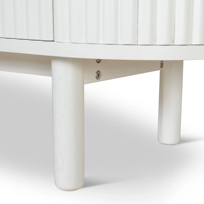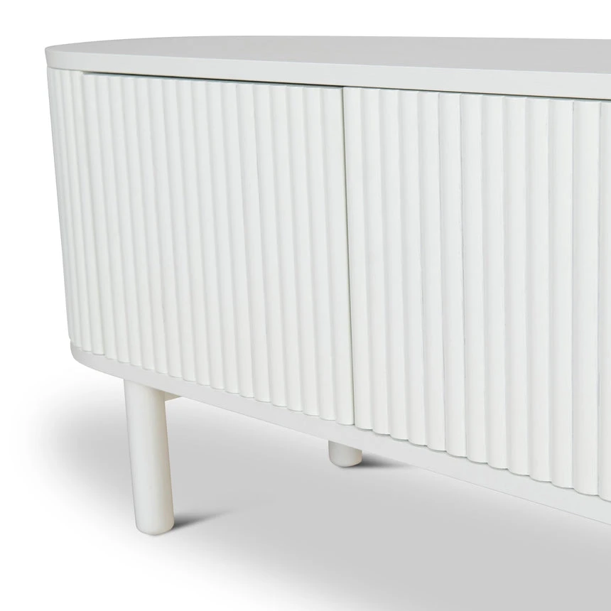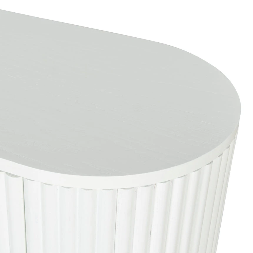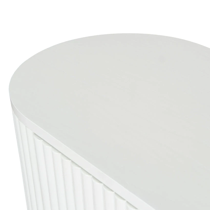 Engineered wood with white oak veneer Solid wood legs with white finish Elongated oval shape Vertical grooved doors Clean sophisticated design Ample storage with multiple shelves Four cable management holes Weight Capacity: 90 kg Product requires 2 person minor assembly