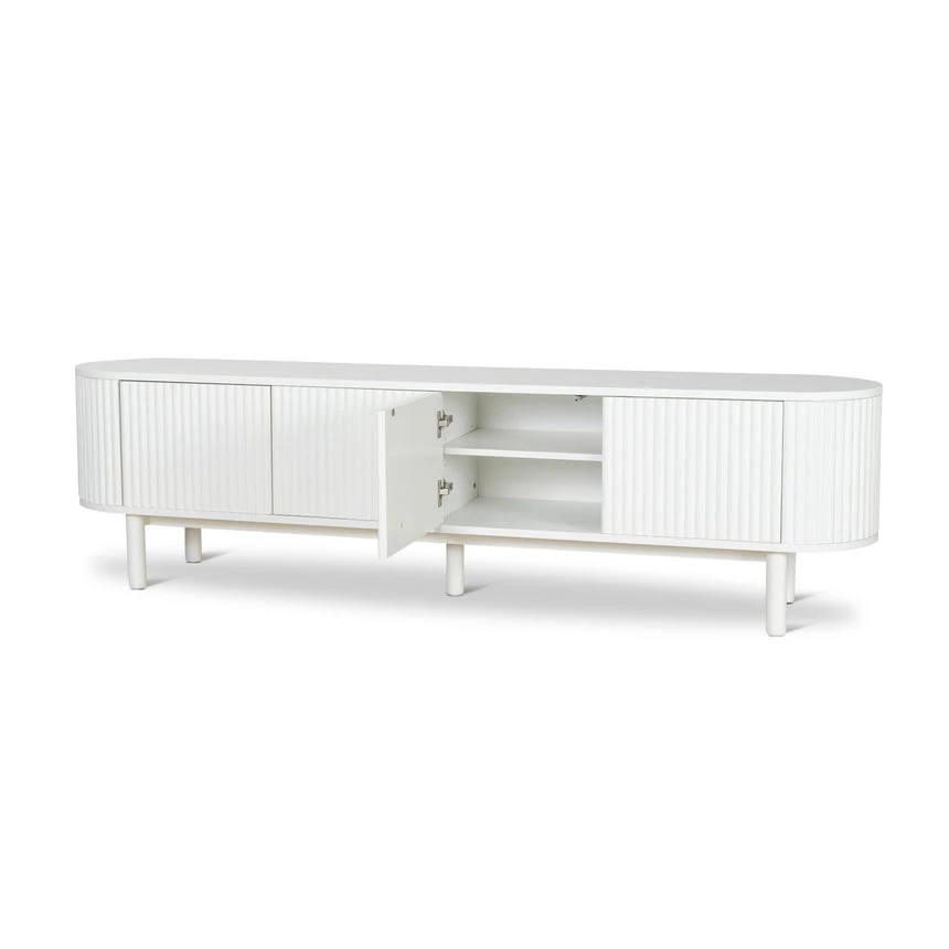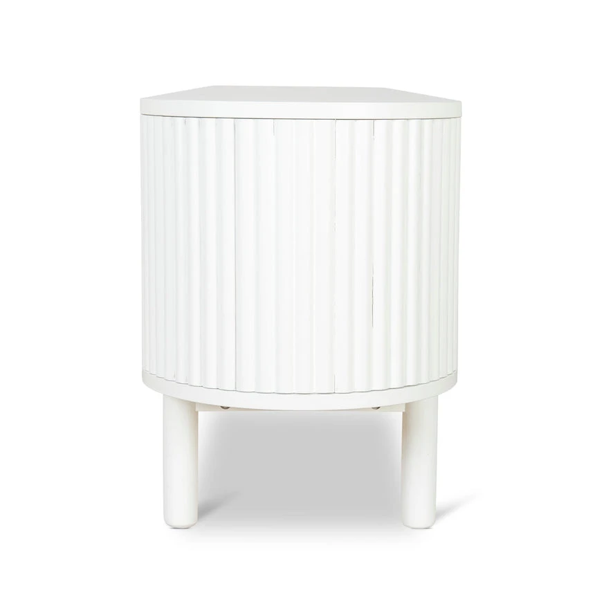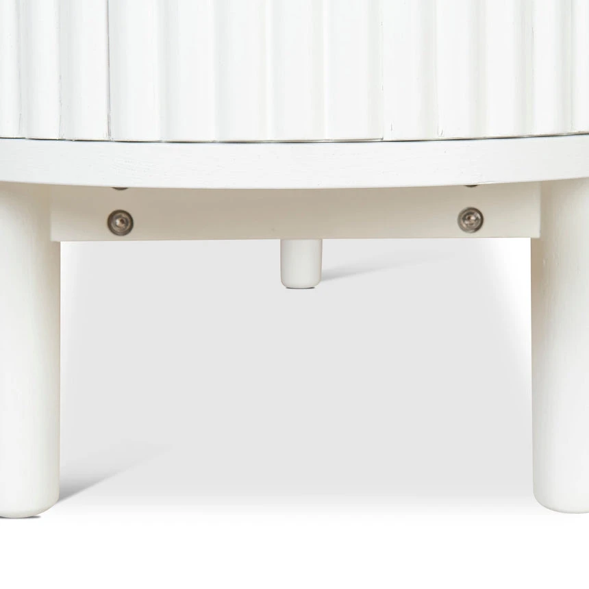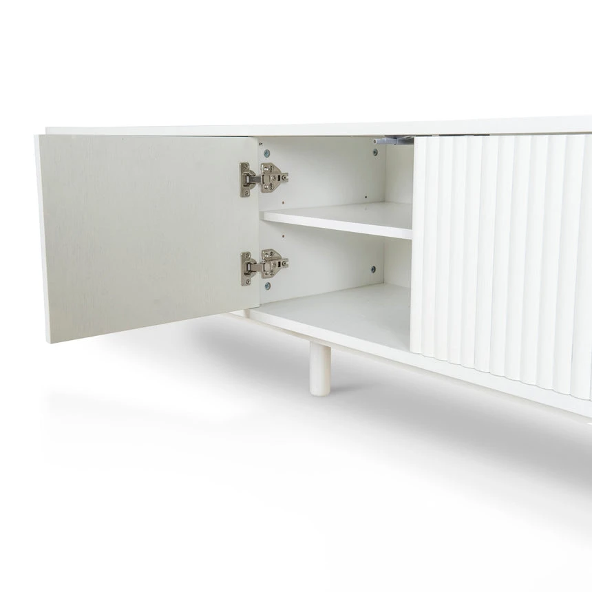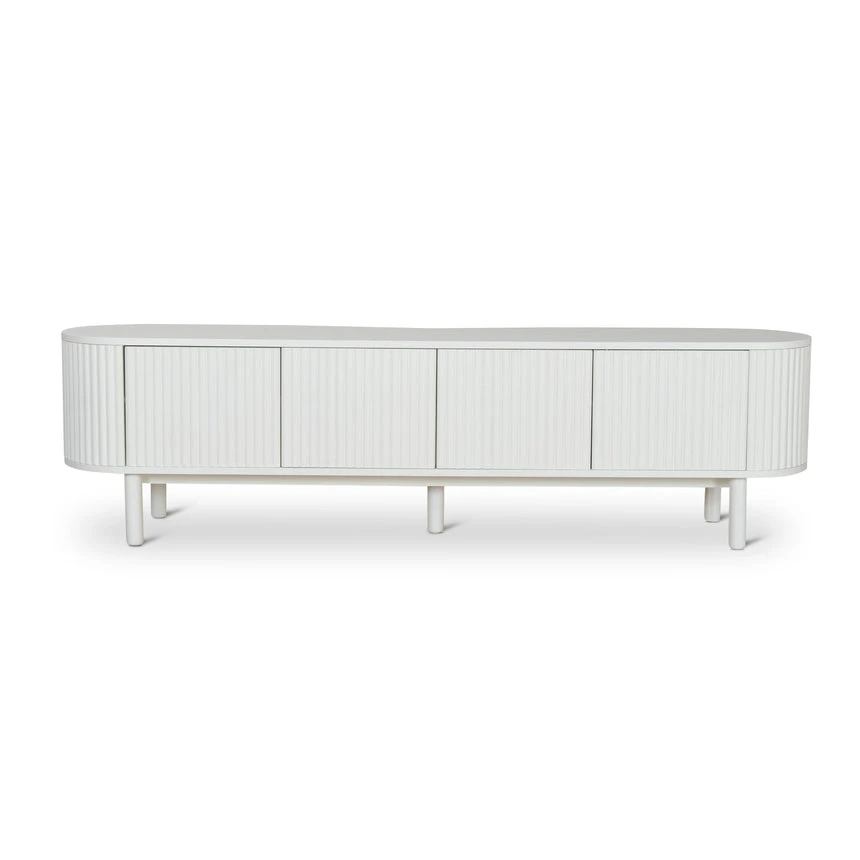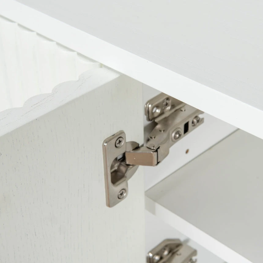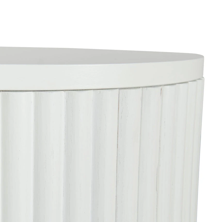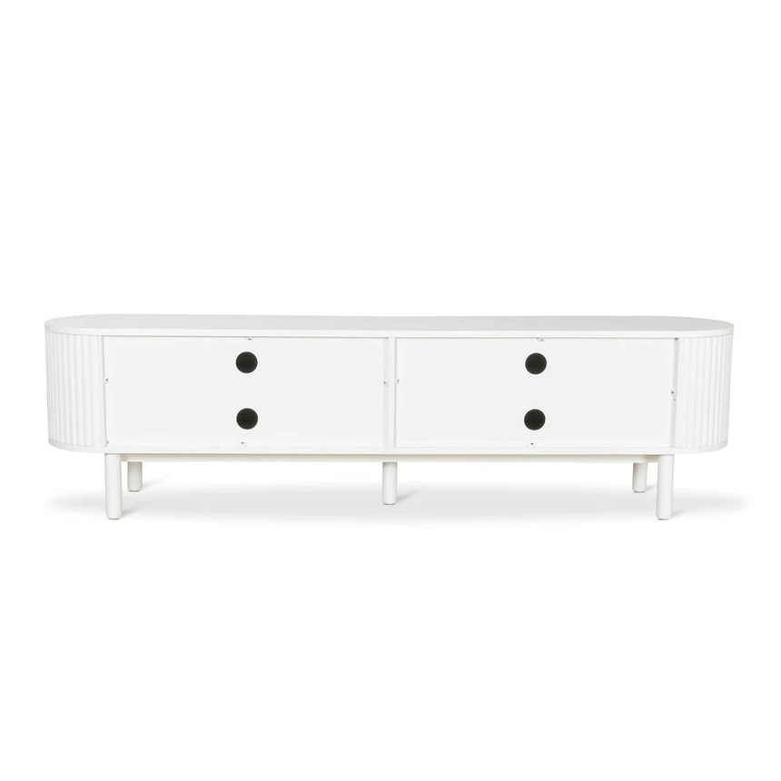 Engineered wood with white oak veneer Solid wood legs with white finish Elongated oval shape Vertical grooved doors Clean sophisticated design Ample storage with multiple shelves Four cable management holes Weight Capacity: 90 kg Product requires 2 person minor assembly