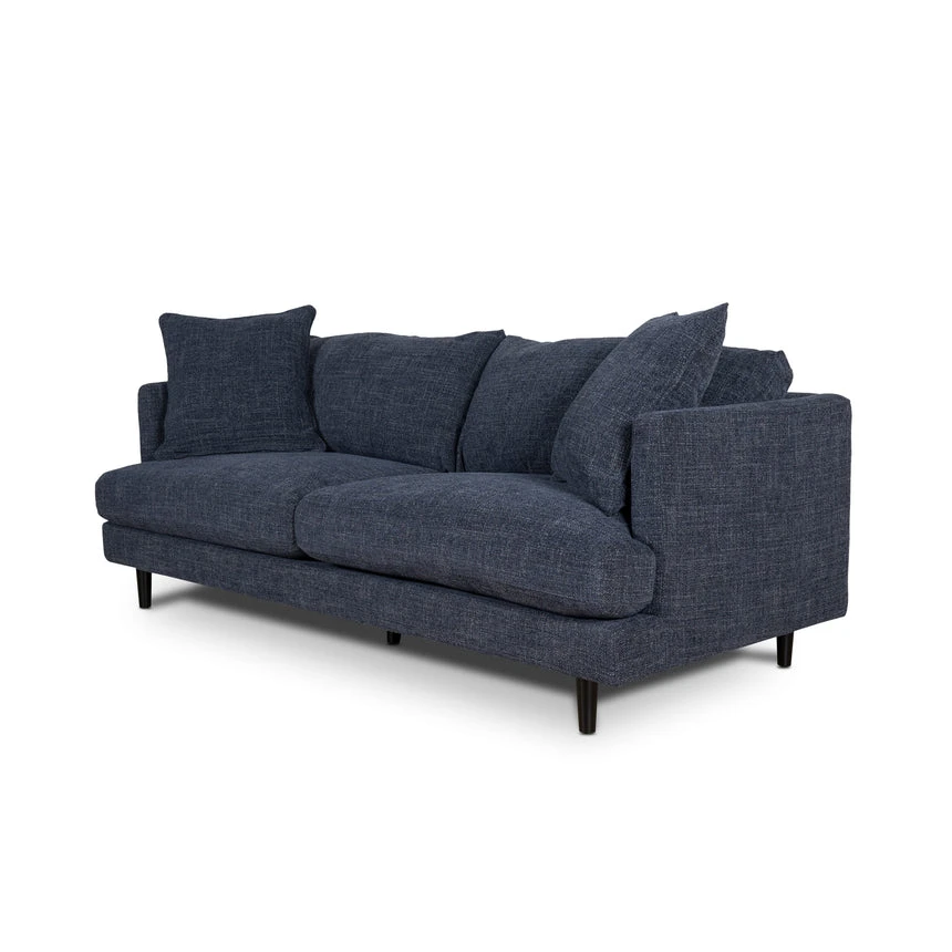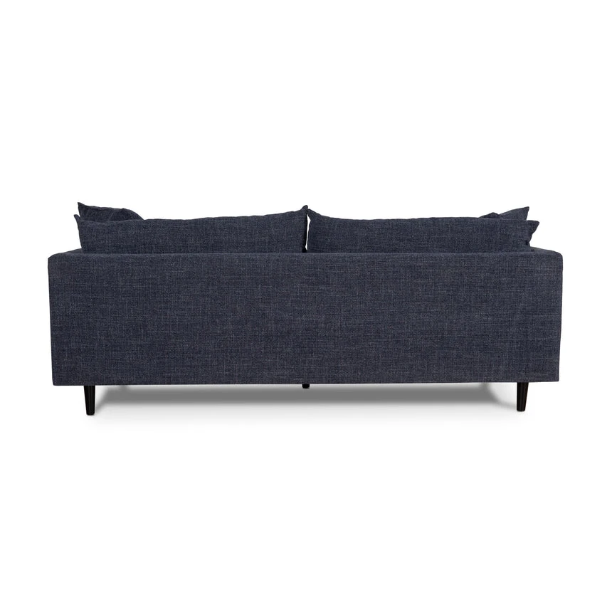 Navy blue polyester upholstery Pinewood frame construction Foam filling cushion Web and spring suspension Loose overstuffed back cushions Matching throw pillows Black ash wood legs Soft medium seat firmness Weight Capacity: 400 kg Minor assembly required