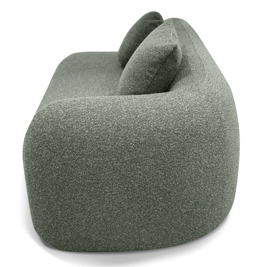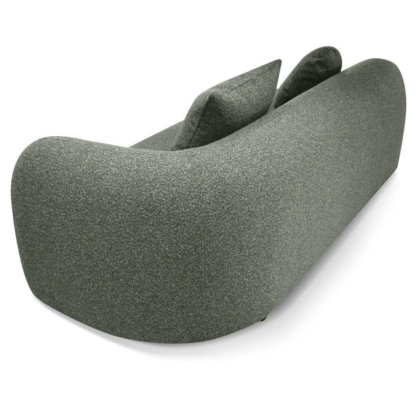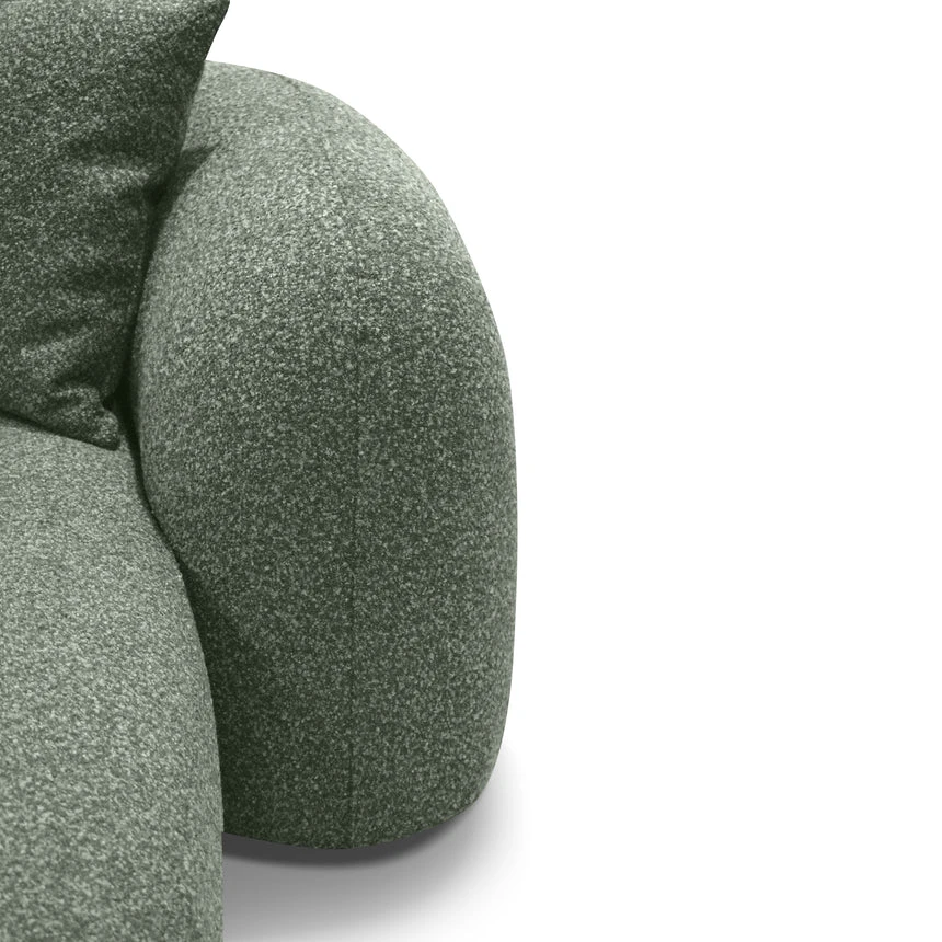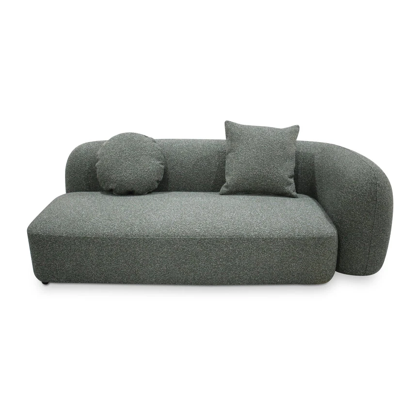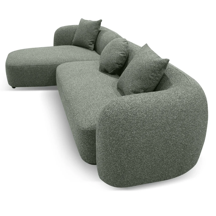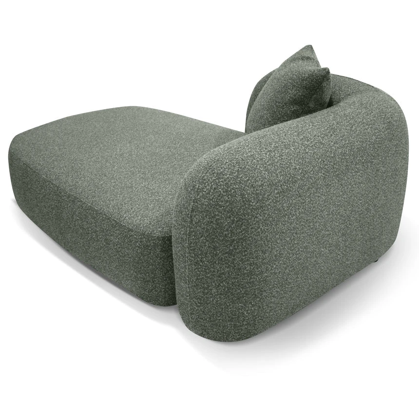81% polypropylene and 19% polyester upholstery Pinewood frame construction Rubber legs Spring suspension system Foam filling with soft-medium seat firmness Amazon green fabric Curved sculptural design Left-facing chaise Distributed weight capacity of up to 480 kg Minor assembly required