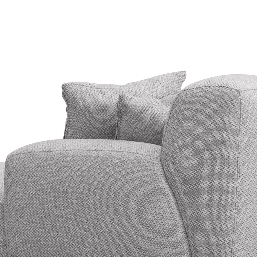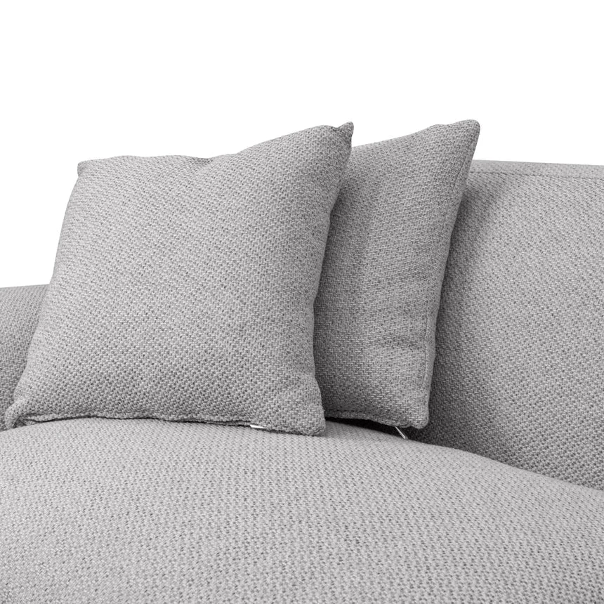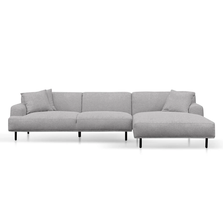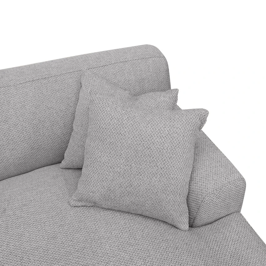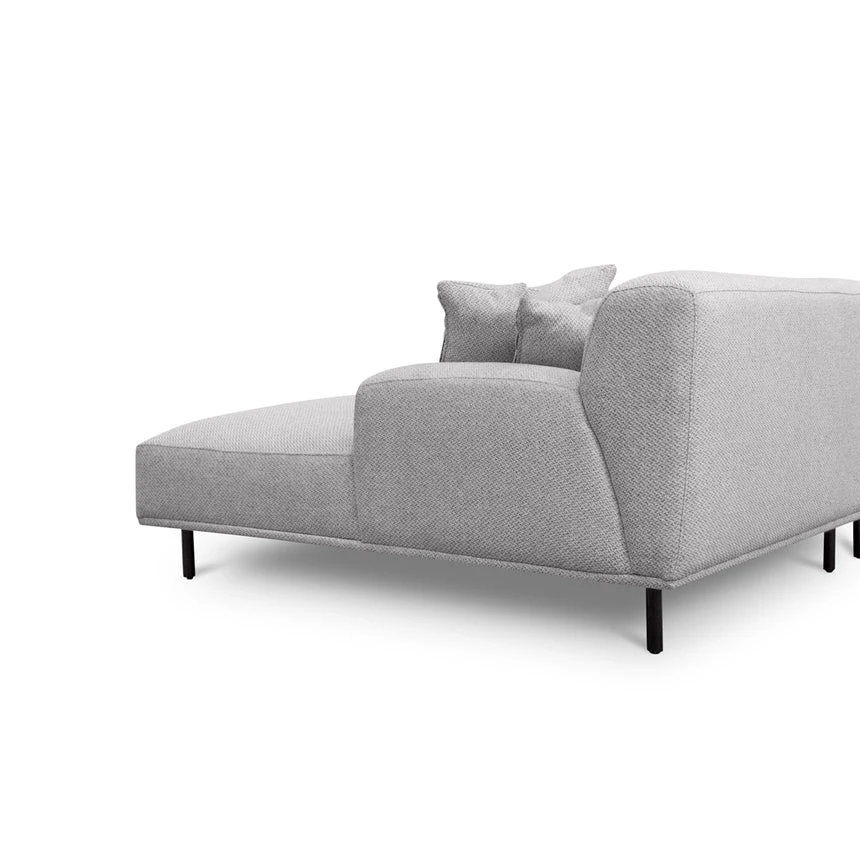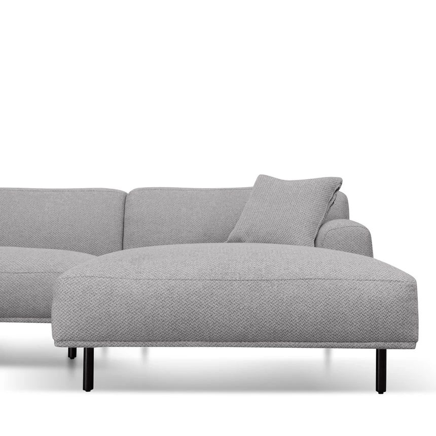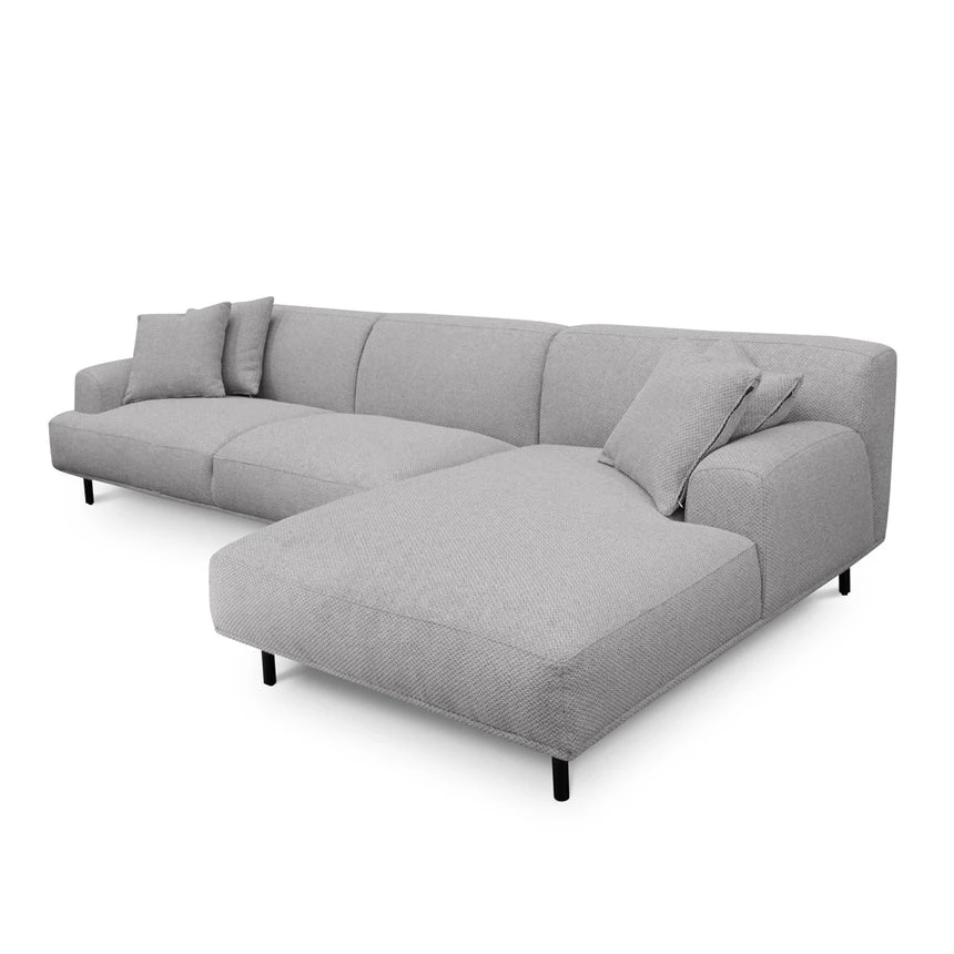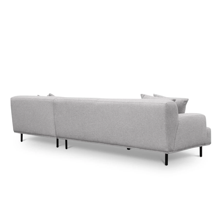 Sterling sand polyester upholstery Pinewood frame construction Right-facing chaise Plush foam and feather filling Soft medium seat firmness Spring suspension Metal legs equipped with floor protectors Weight capacity: 400 kg Minor assembly required