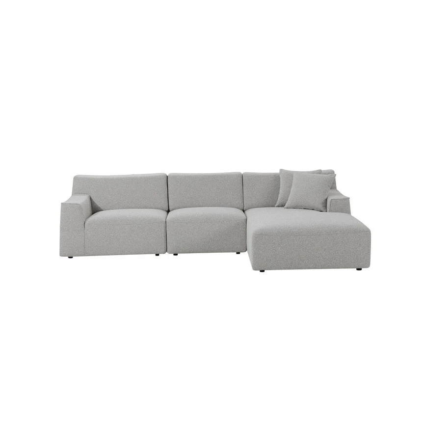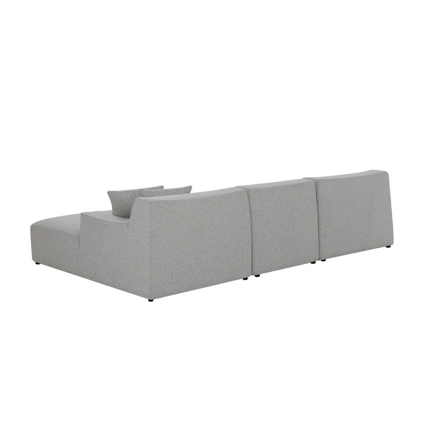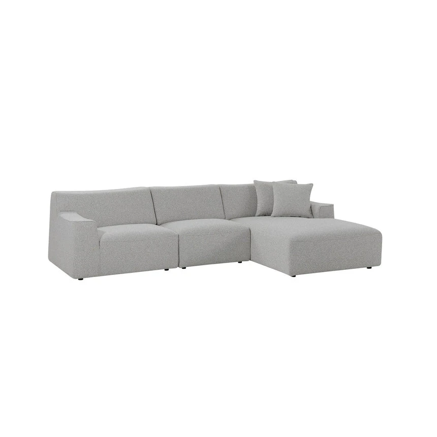 Clay grey polyester upholstery Pinewood frame construction Right-facing chaise Plush foam filling Medium seat firmness Spring suspension Legs equipped with floor protectors Suitable for commercial use Weight capacity: 700 kg Minor assembly required