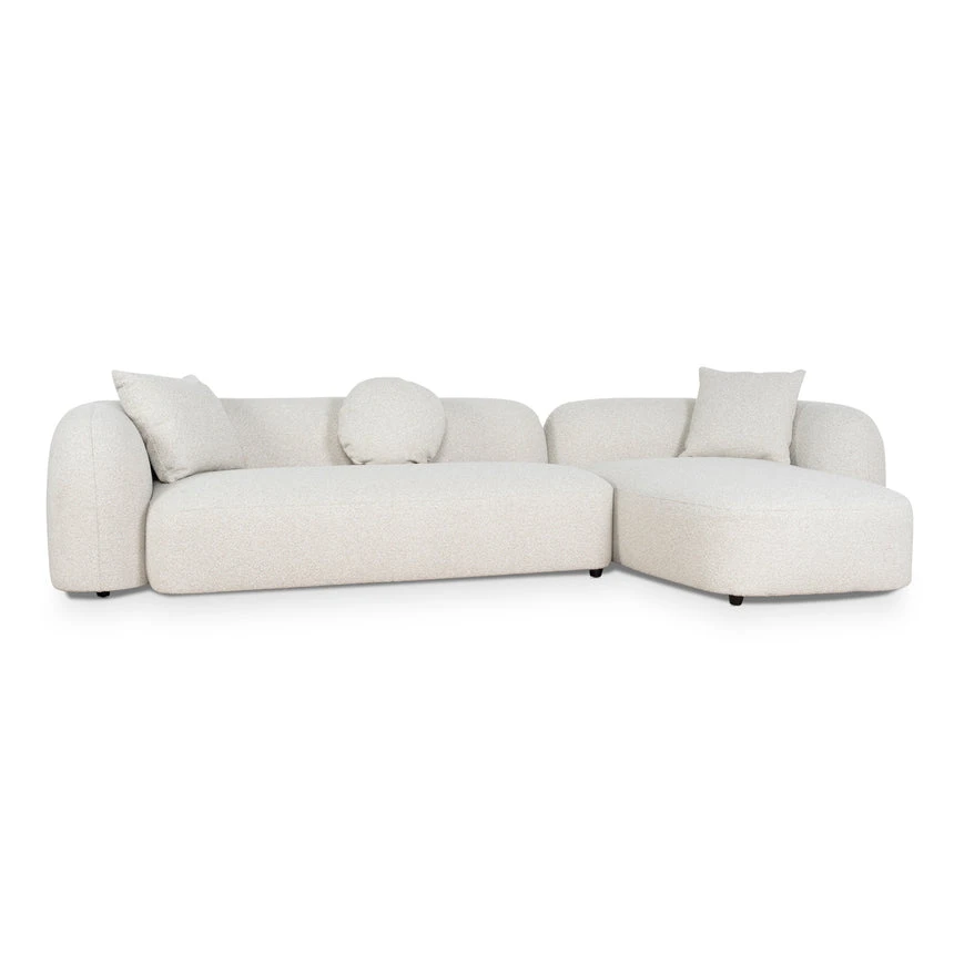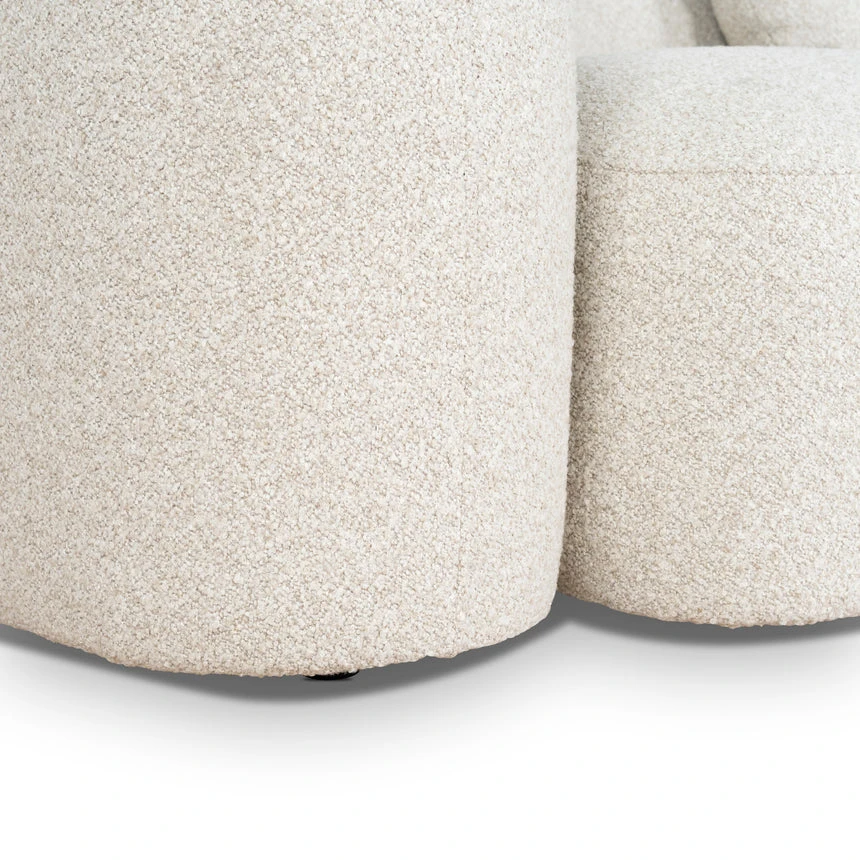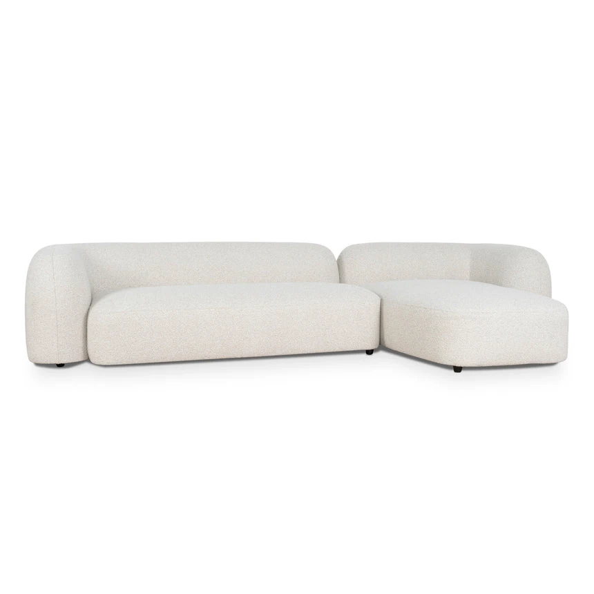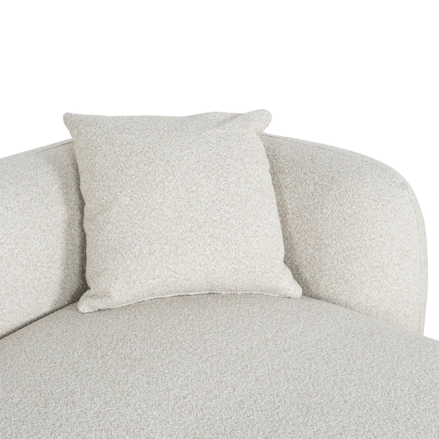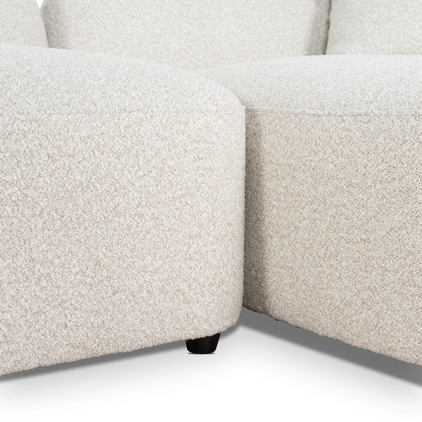 81% polypropylene and 19% polyester upholstery Pinewood frame construction Rubber legs Spring suspension system Foam filling with soft-medium seat firmness Oatmeal beige fabric Curved sculptural design Right-facing chaise Distributed weight capacity of up to 480 kg Minor Assembly Required