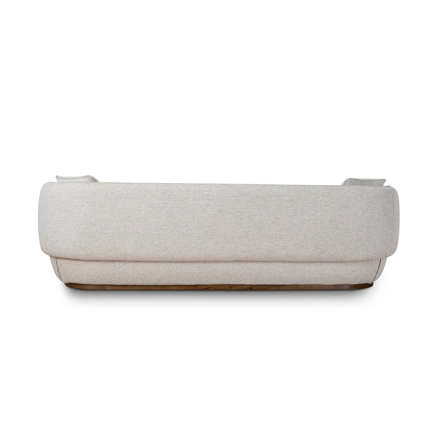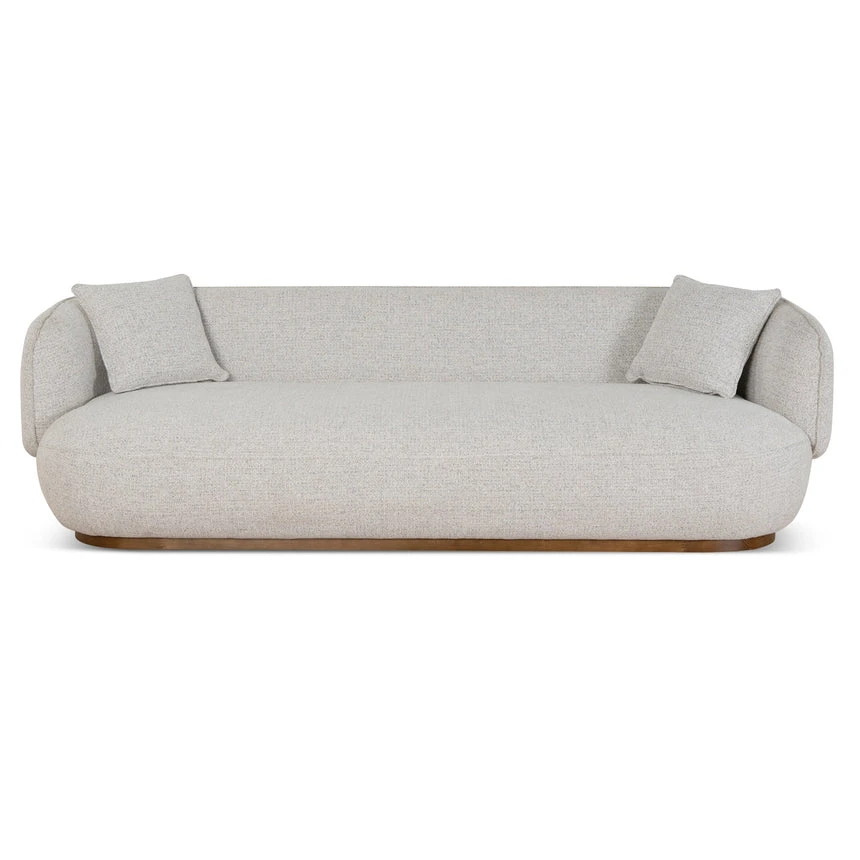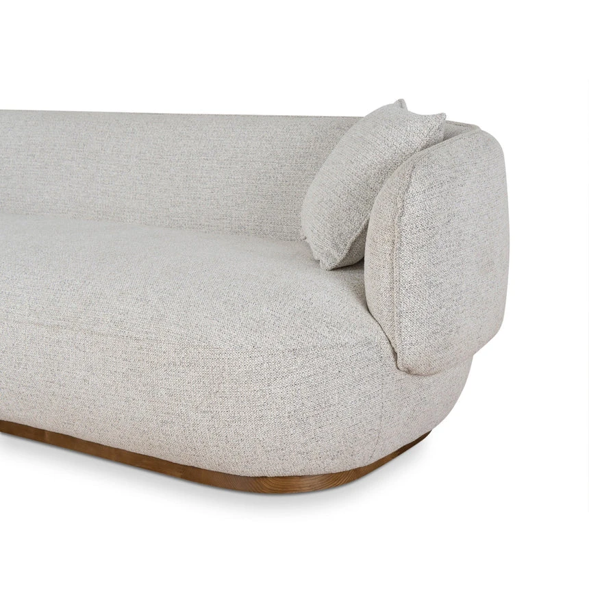 Pepper beige polyester upholstery Pinewood frame construction Soft-medium seat firmness Web and spring suspension Ash wood legs Plush foam filling Seamless backrest and armrest integration Modern low-grounded appearance Weight Capacity: 400 kg Product comes fully assembled
