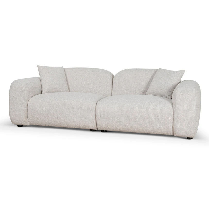 Stone Beige polyester upholstery Wood frame with plywood construction Spring suspension Soft seat with foam filling Rubberwood timber legs Rounded design with curved armrests Distributed weight capacity of up to: 250 kg Assembly Information: Please note that the feet of the sofa should be positioned in the desired location, ensuring the screws are secured within the corner wooden frame. There are no pre-marked spots for the feet, allowing flexibility in alignment and visibility of the feet for aesthetic preferences. An electric drill is required to secure the screws into the feet for proper assembly. The sofa does not require the connectors for regular use, but they are supplied as an optional feature. If you wish to lock the two sofa sections in place, position the sections together and drill in the connectors along the edge of the base frame, following the indicated line.