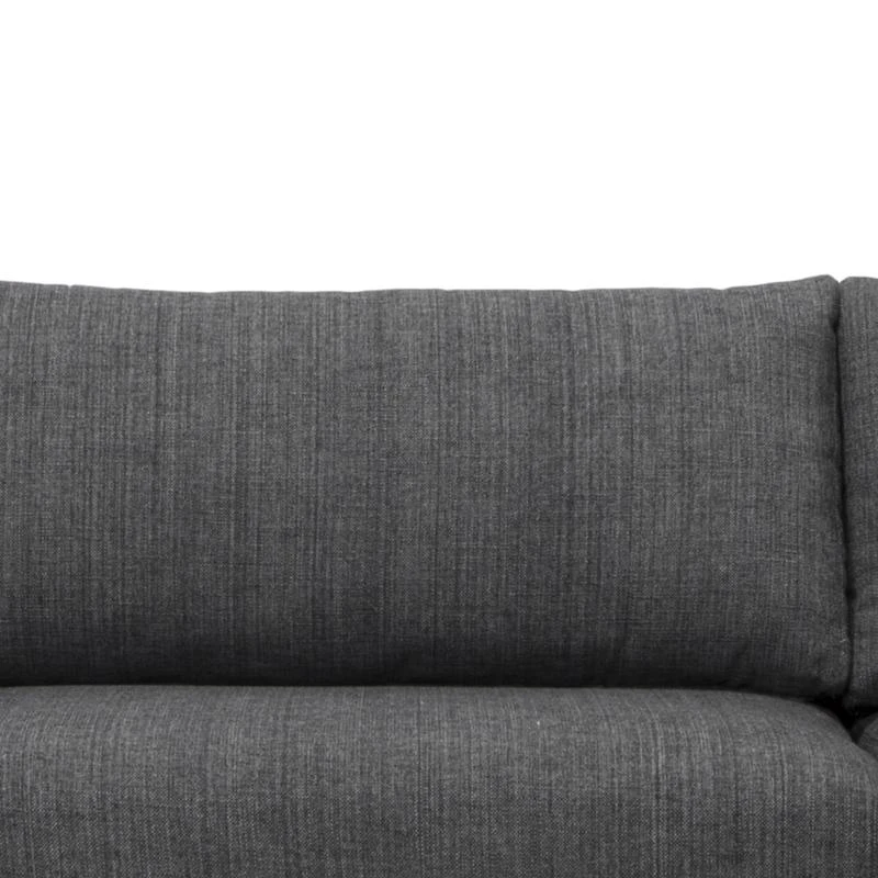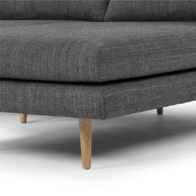 Sturdy construction with lifetime appeal featuring solid oak legs Upholstered in metal grey fabric for durability and a soft look and feel High-density foam cushions for excellent comfort and supporting form Soft lines, thick cushioning and straight tapered legs make the sofa a flexible and cosy design option to suit a variety of spaces Dark grey hues and natural wooden tones combine to give you a neutral colour theme you can easily work into your existing décor Featuring a right chaise for additional space and comfort Care instruction