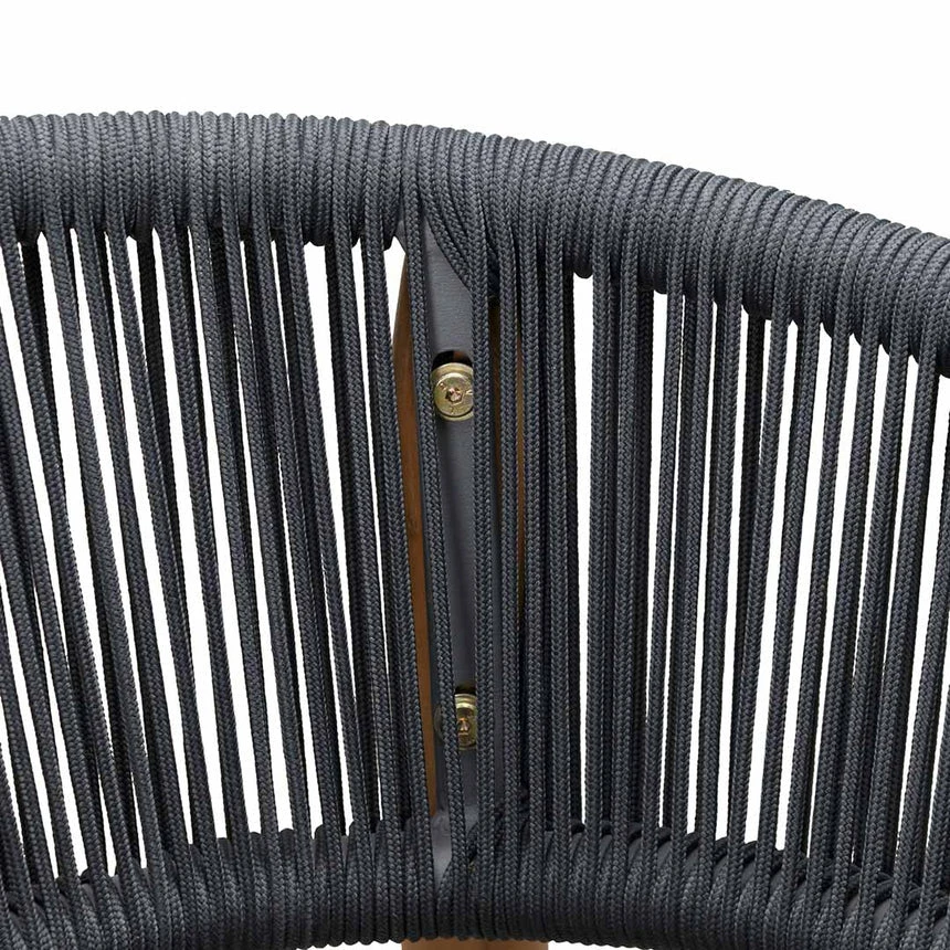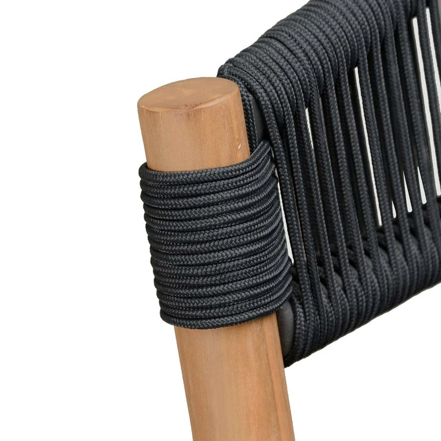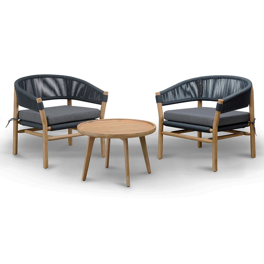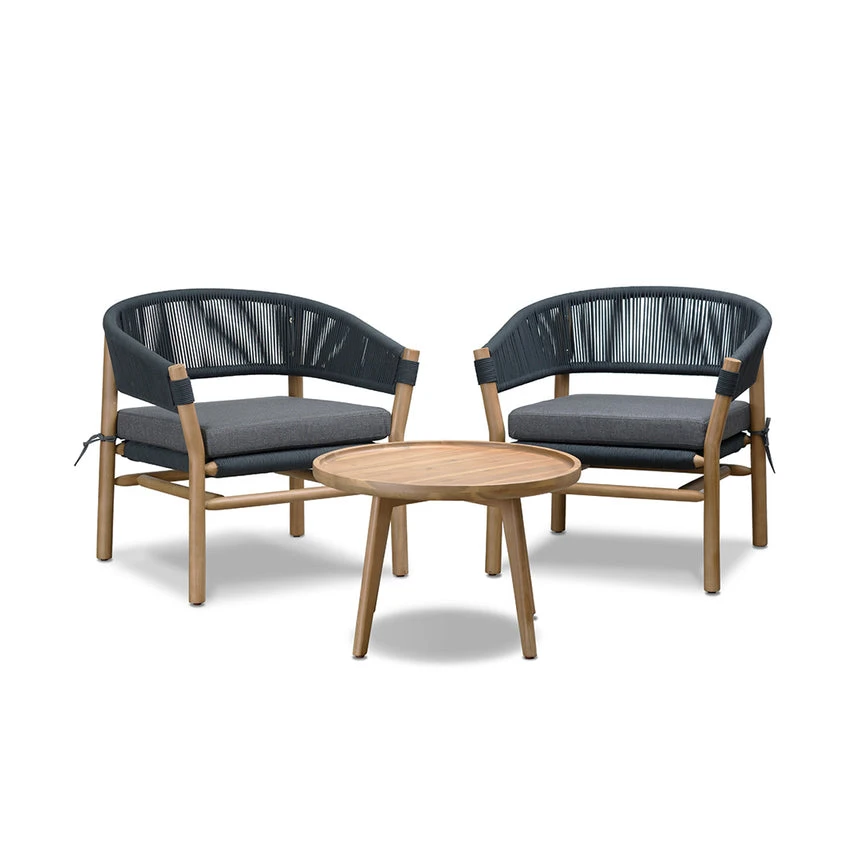 Powder coated aluminum frame Solid acacia wood legs Modern style blended with classic design 2x chairs with 4.5mm polypropylene round rope 1x Round table 100% polyester fabric anthracite cushion Chair: 120kg Table: 75kg, weight limit Not suggested for commercial use Product comes flatpack