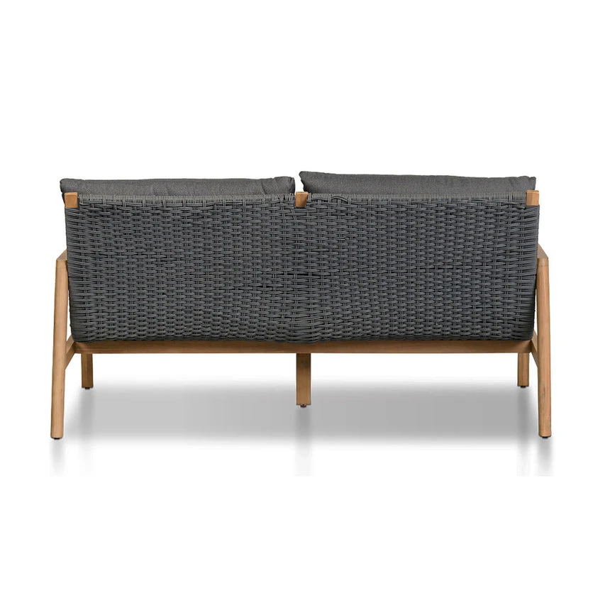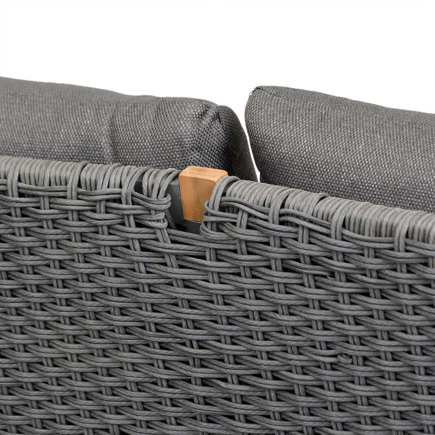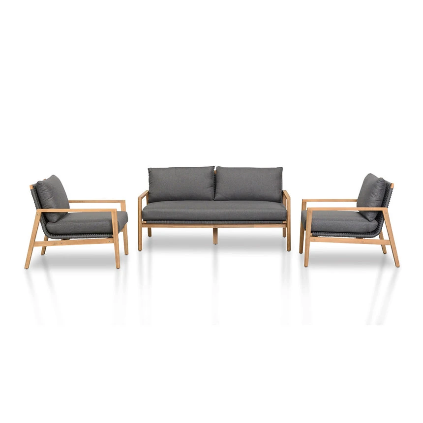 5mm Wicker oval rope seat Acacia wood construction in natural Tub chair silhouette with flared rear legs Deep wood grains visible throughout Cushions upholstered in 100% polyster fabric Features 2x lounge seats and 1x love seat Weight limit 160kg chairs and 320 kg bench Product is flat packed and requires two-person assembly Note: Although this item is weather proof, as with all Outdoor products, to preserve the longevity of the product, it’s recommended this product is kept under cover from harsh Australian elements.