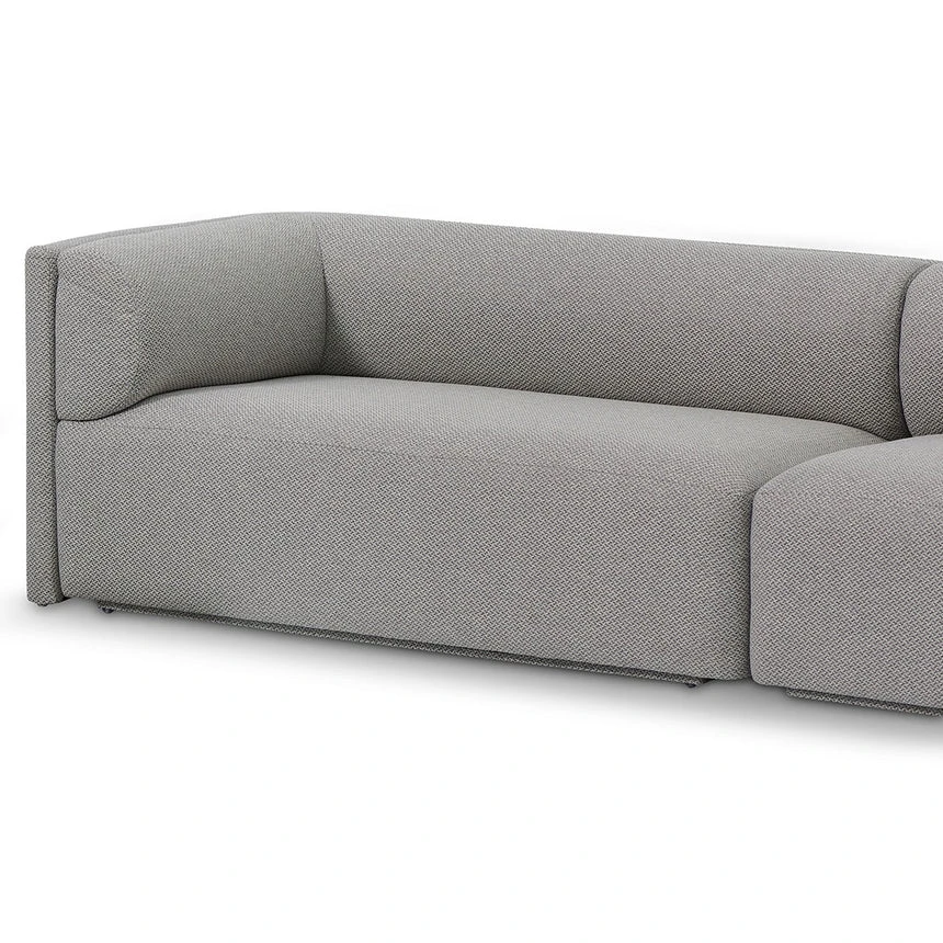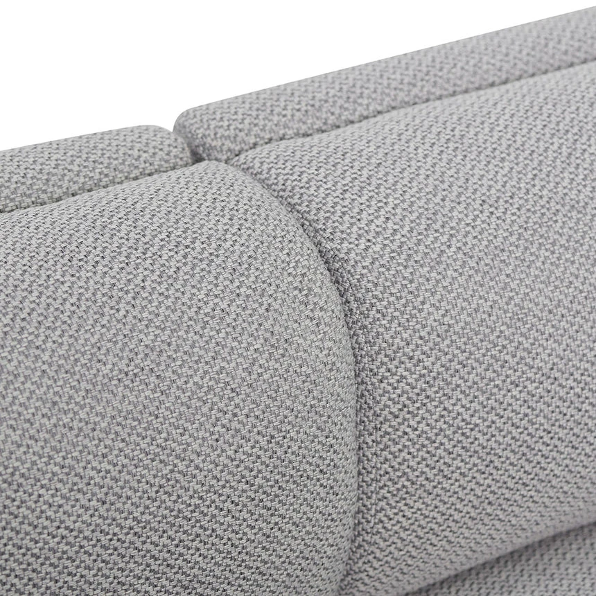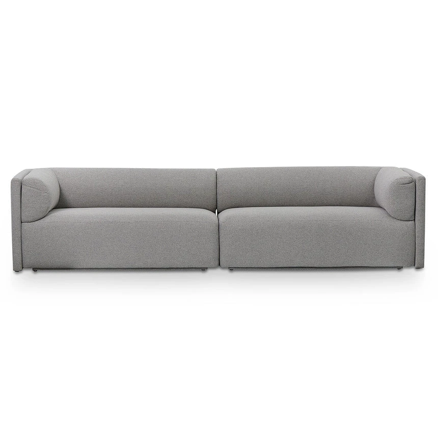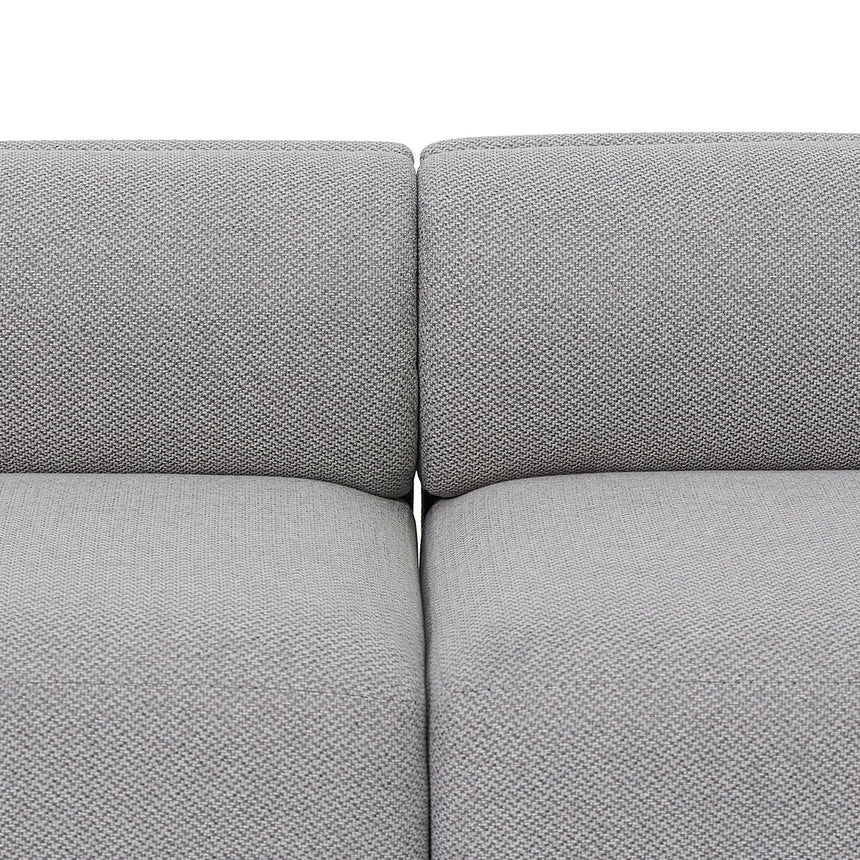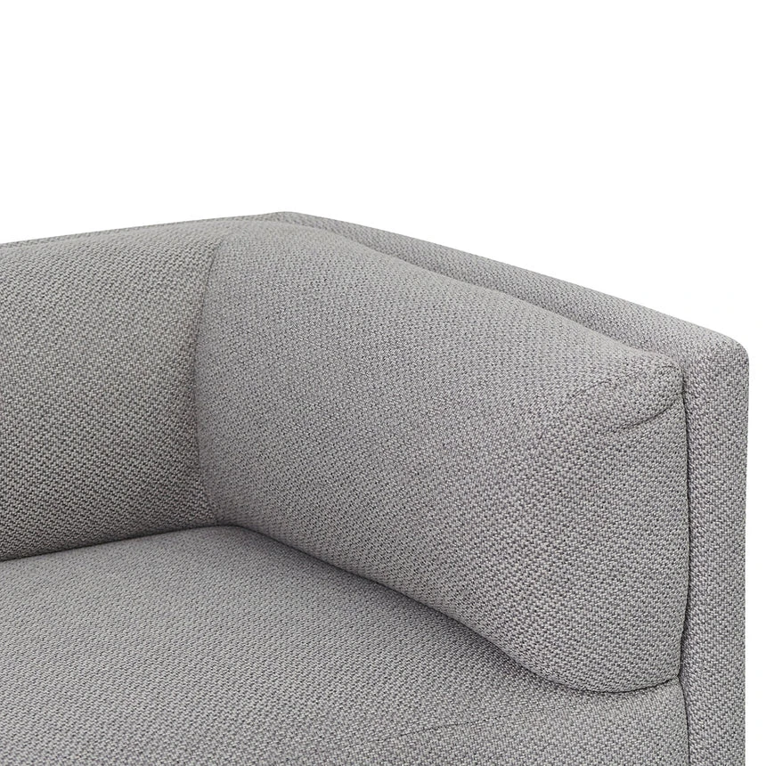 Upholstered in a 100% grey polyester fabric Pinewood frame construction Square and modest base in a matte black wood build Spring and webbing suspension for lasting structural integrity Back and seat cushion with a high-density foam filling Includes 2x matching scatter cushions Product is fully assembled Note: Due to the nature of timber and veneer, any variations of wood grain and colour are not inconsistencies and should be appreciated.