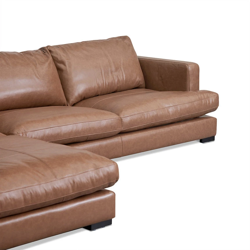 Upholstered in full-grain caramel brown leather Filled with foam and fiber Web-spring suspension High-quality timber frame 4x cushioned seats with tight chaise Black legs made of plastic legs with floor protectors Product needs minor assembly