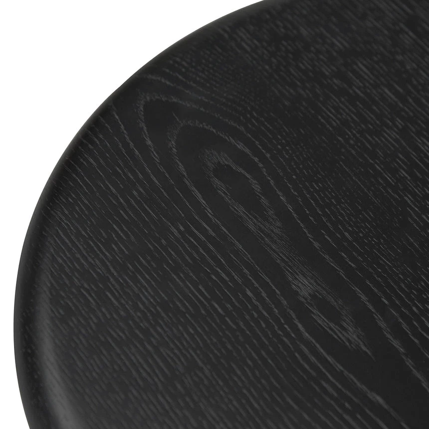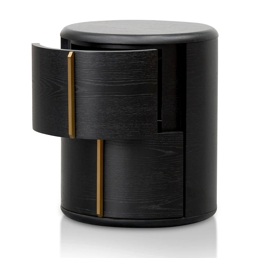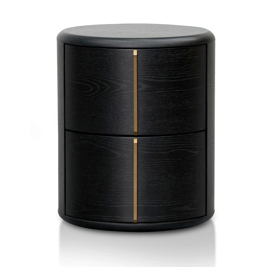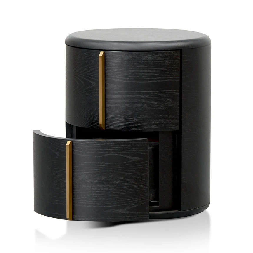 Made of engineered wood with veneer Minimalist round contour 2x drawers with pull opening mechanisms Metal handles crafted in brass All-over full matte black finish Product is fully assembled