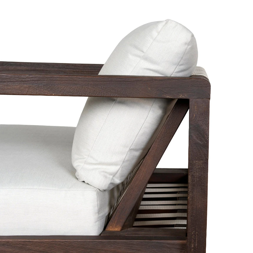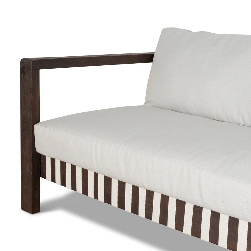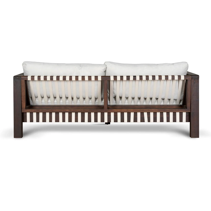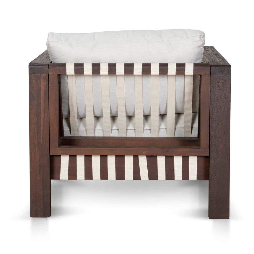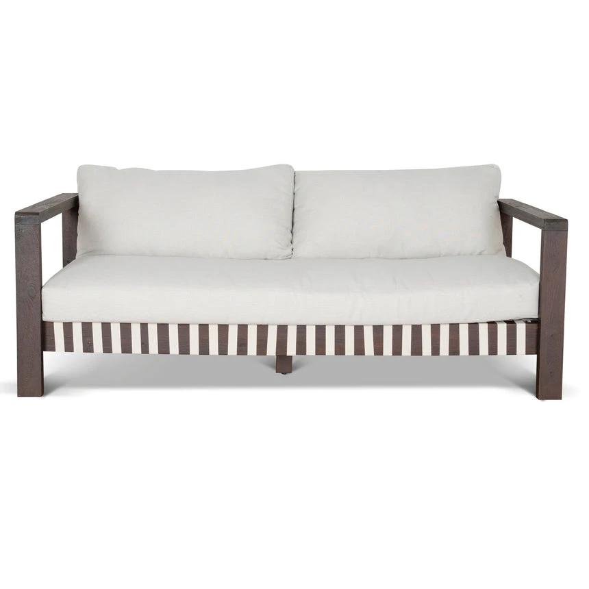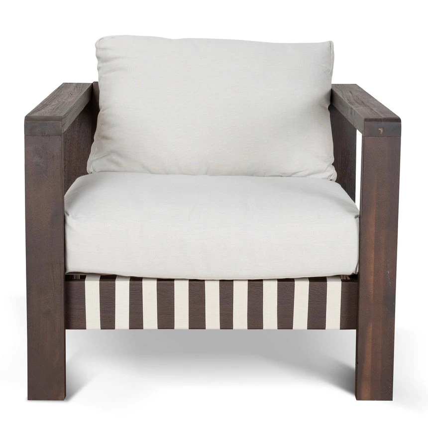 Royal sand polyester upholstery Timber wood frame Dark brown acacia legs Soft-medium seat firmness Foam and polyester fiber filling Unique striped pattern Ideal for outdoor lounging Wooden coffee table with slatted top Weight Capacity: Chair 120 kg, Bench 240 kg Minor Assembly Required