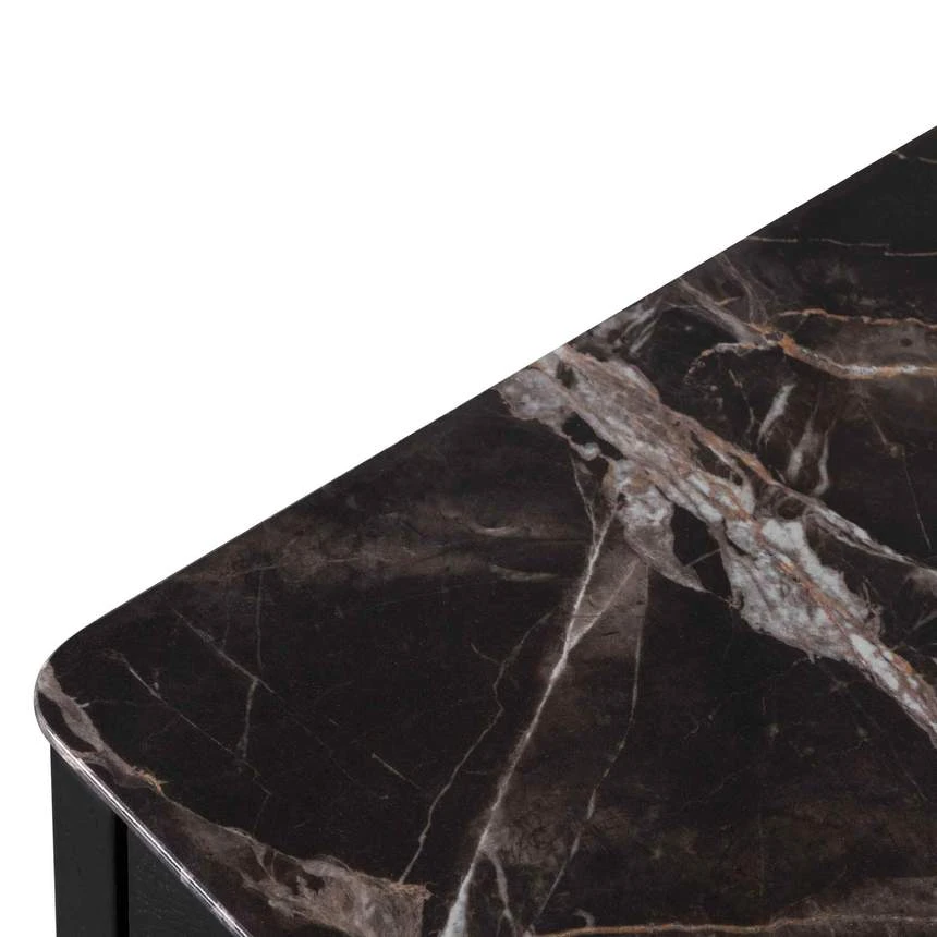 Made from durable engineered wood with black veneer Geometric handle in a brushed brass finish Marble table top featuring brown and white veins Leg mid-section featuring a subtle arch detailing 1x pull-out drawer for storage Minor assembly required to assemble handle on unit Note: Due to the nature of timber and veneer, any variations of wood grain and colour are not inconsistencies and should be appreciated as a characteristic of the table. We recommend the use of placemats and/or coasters to protect the product.