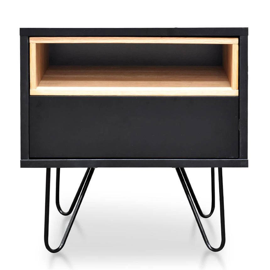 Features 1x push-to-open drawer and 1x single top-tiered shelf for convenient storage Made from durable MDF in a black matte finish while top-shelf finished with natural wood veneer Strong and stable metal hairpin legs in a black powder coat finish Light and minimalist styled legs add balance to a top-heavy design Notes: Product is flat packed and requires assembly with an electric drill. As this product is flat-packed, please note that once the item has been partially or fully assembled, it will not be eligible for a change of mind return. Change of mind returns will only be accepted if the assembly has not been attempted and the item is in the original packaging.