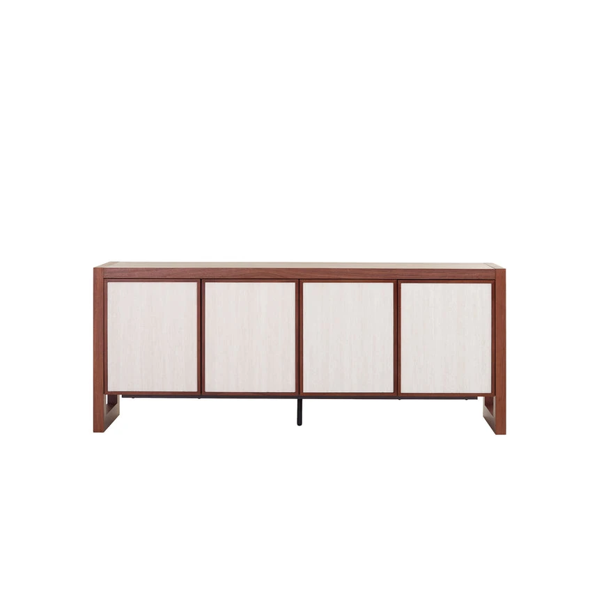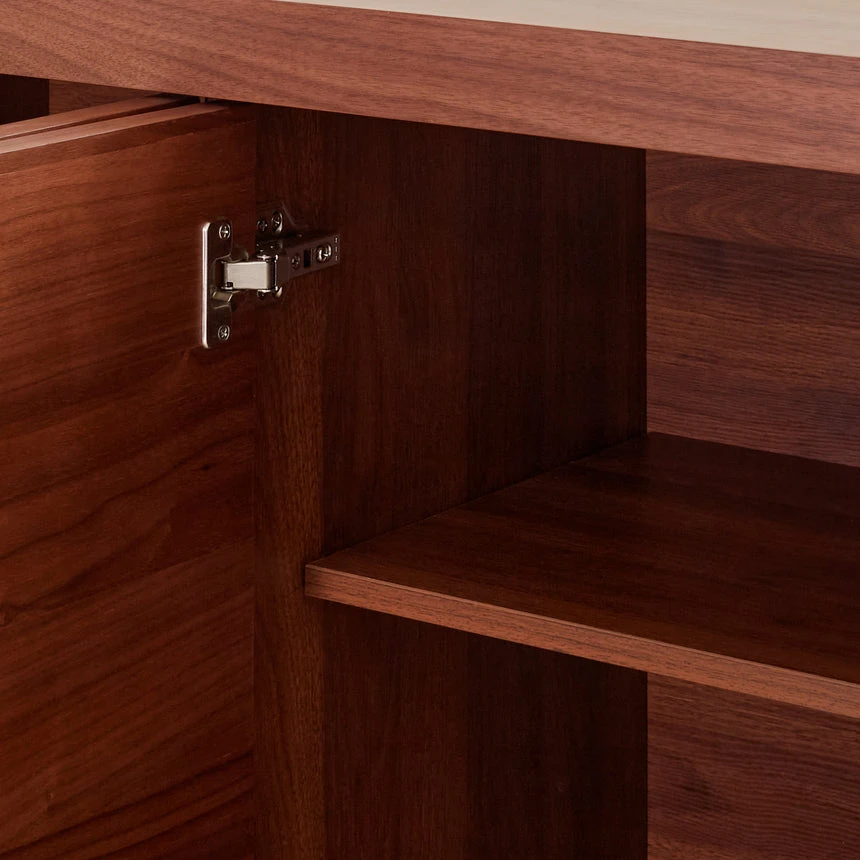Matte textured travertine look on external door Engineered wood, walnut veneer for tabletop, legs, and door Walnut melamine board Rectangular loop legs 4 doors, 8 concealed shelves Push-to-open door mechanism Weight capacity: 100 kg Minor assembly required