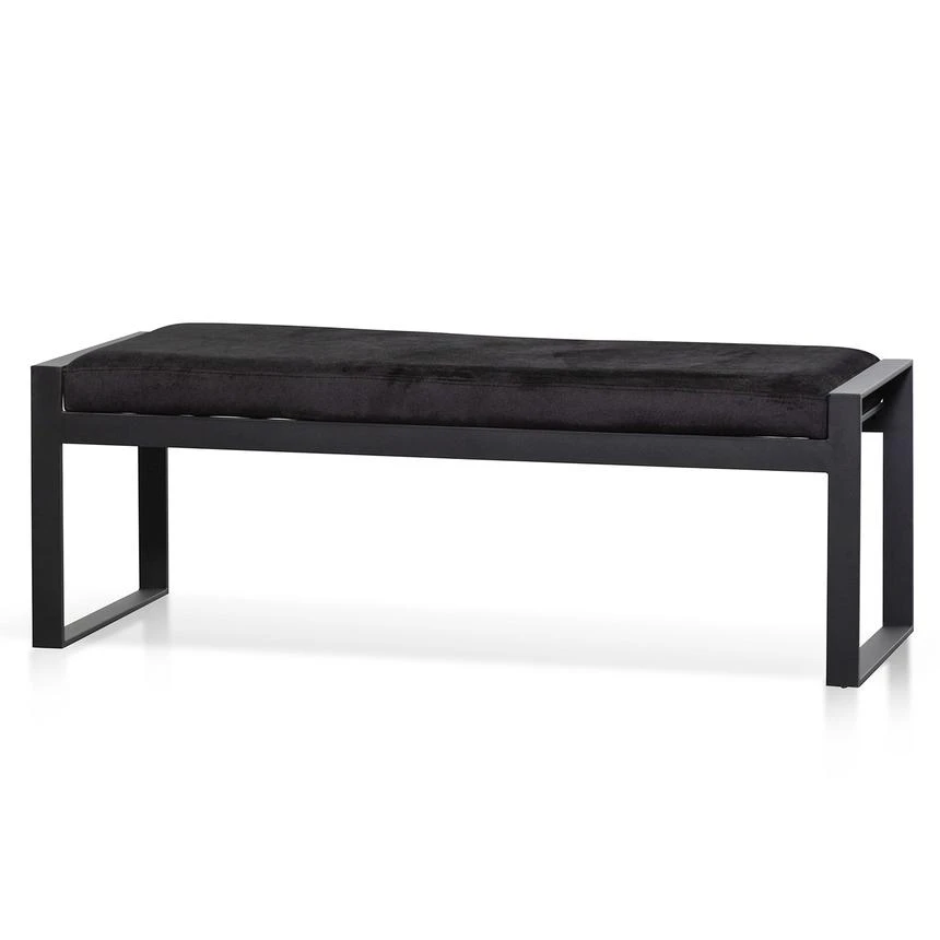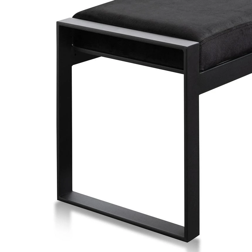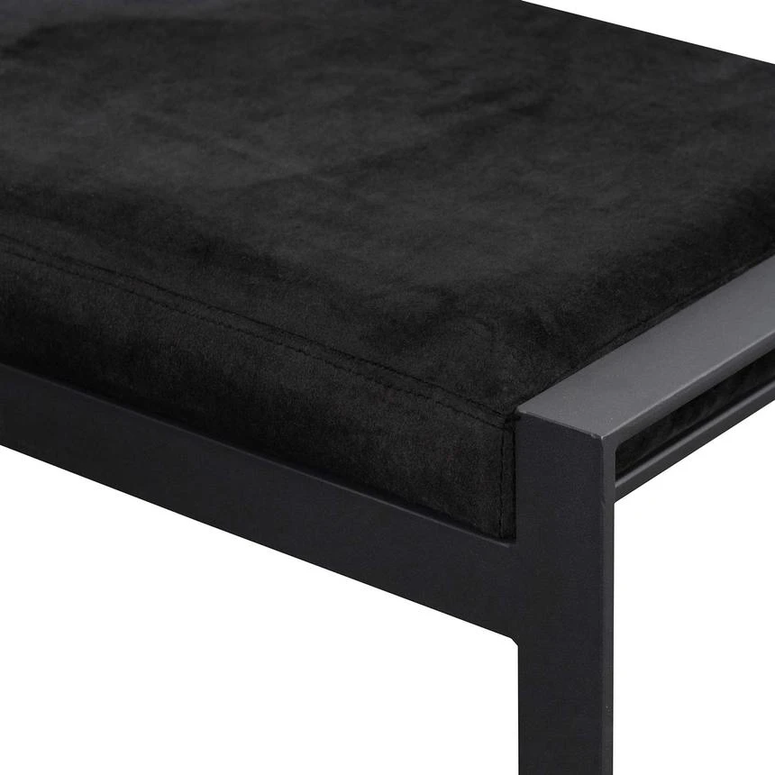 Matte black steel construction Seat cushion upholstered in a black velvet Square sled style base Seat rest sits plush within frame Matching all black colour palette Product comes fully assembled