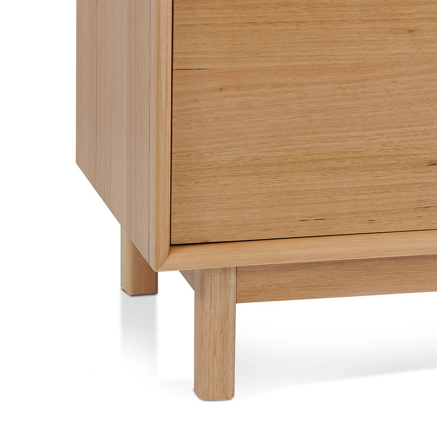 Top, sides & drawers/doors are made of engineered wood Finished in wood textured veneer Legs and front frame are made of solid Messmate Square legs with floor protectors 3× drawers with slides for pull-opening 2× cabinets, each containing double shelves for storage Round brass knobs on the drawers and cabinet doors Weight Capacity: 150 kg Product is fully assembled