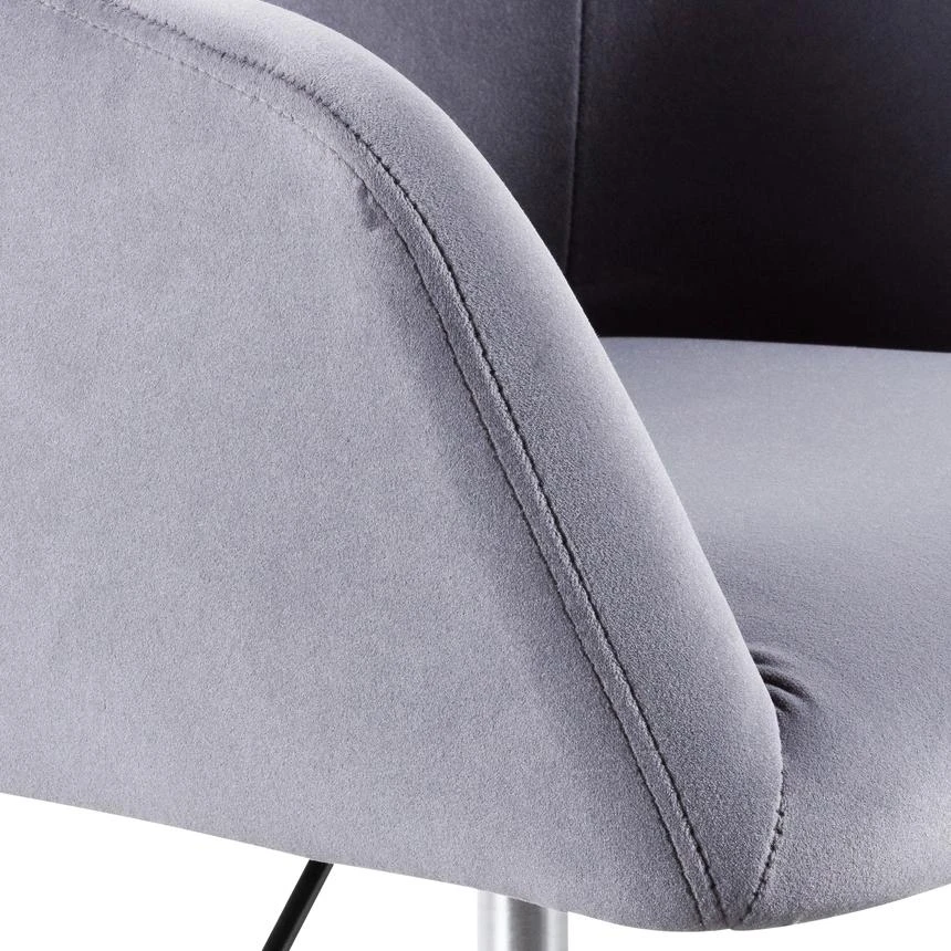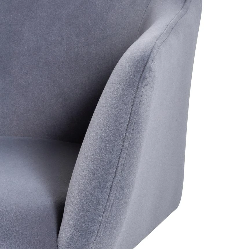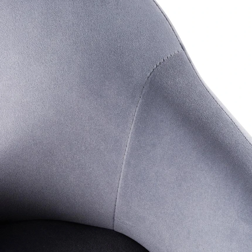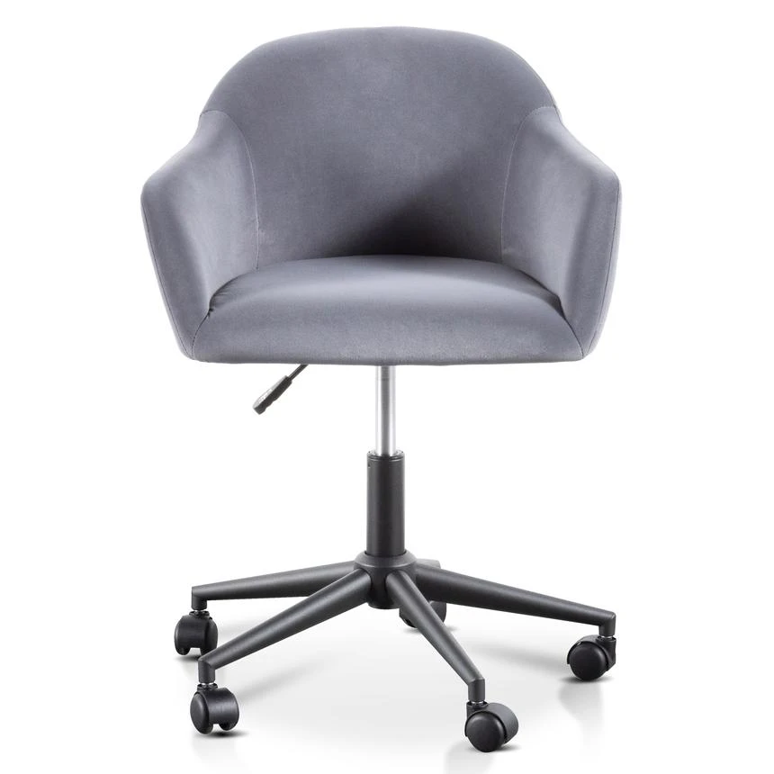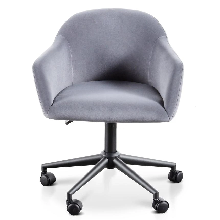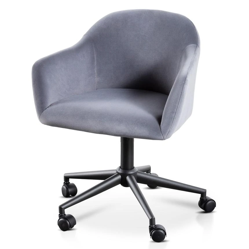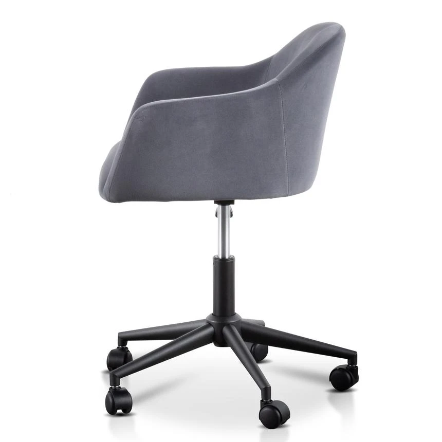 Durable velvet upholstery in charcoal finish Metal frame and detailing in chrome Moulded polywood seat with premium foam insert 5 star heavy duty nylon castor wheels with powder black base Tub shaped chair with waterfall seat design 360 degree swivel with adjustable gas-lift seat height Product is flat packed and requires two-man assembly