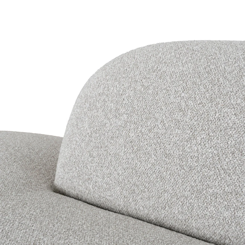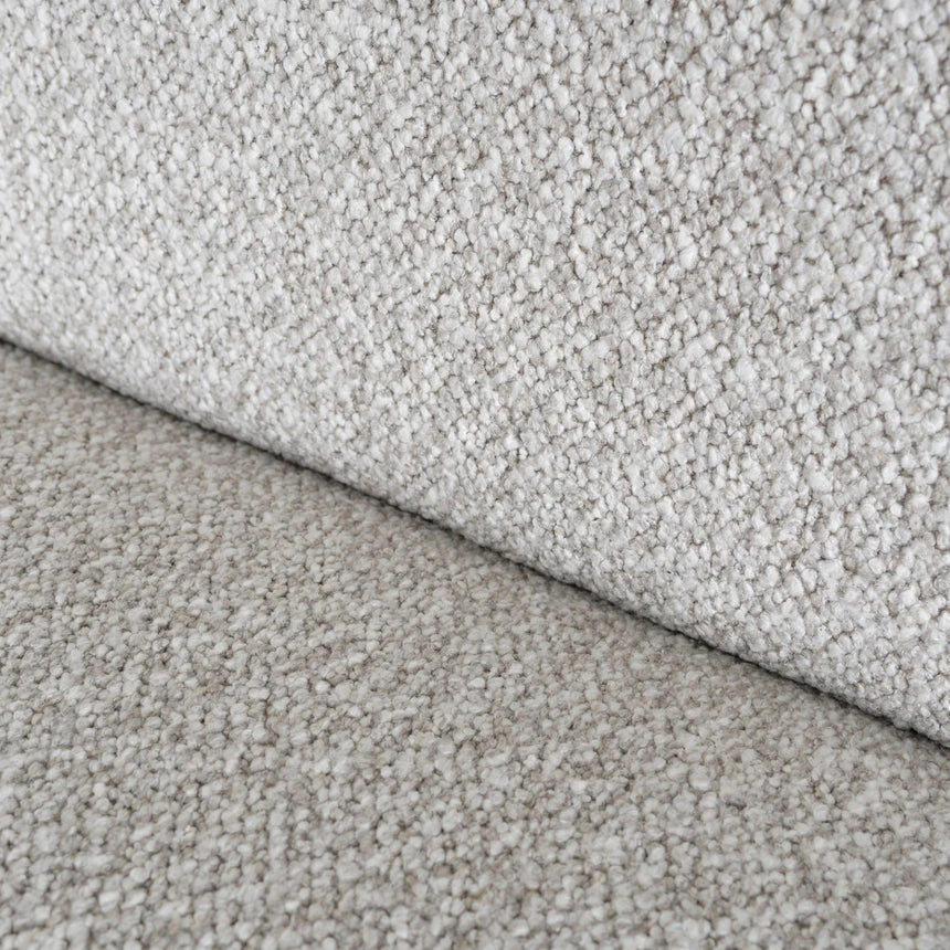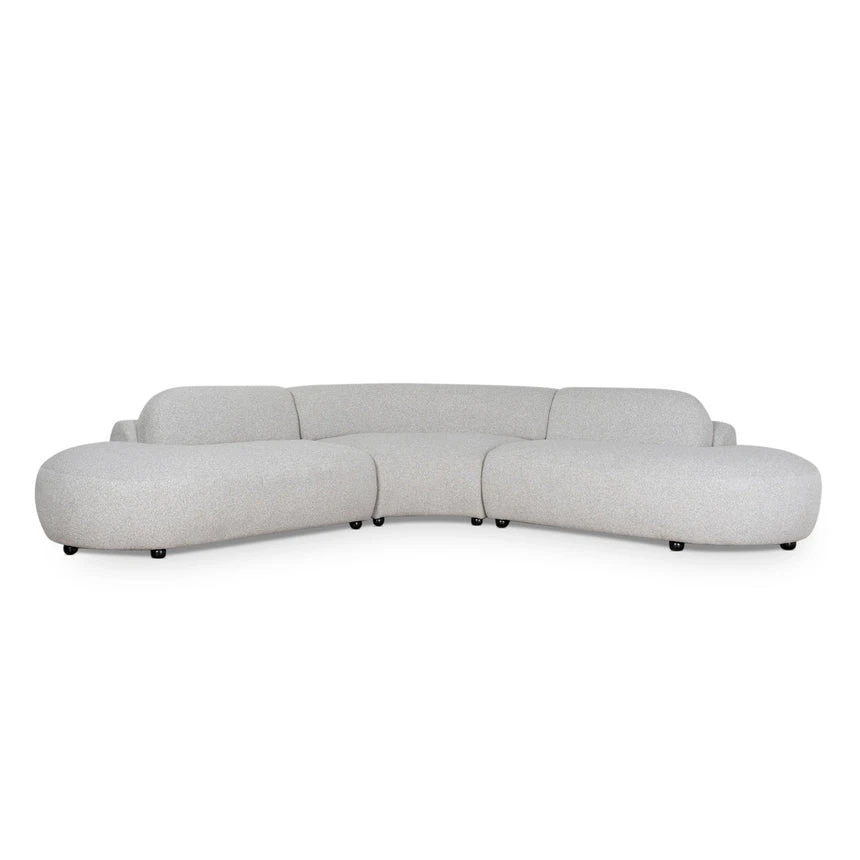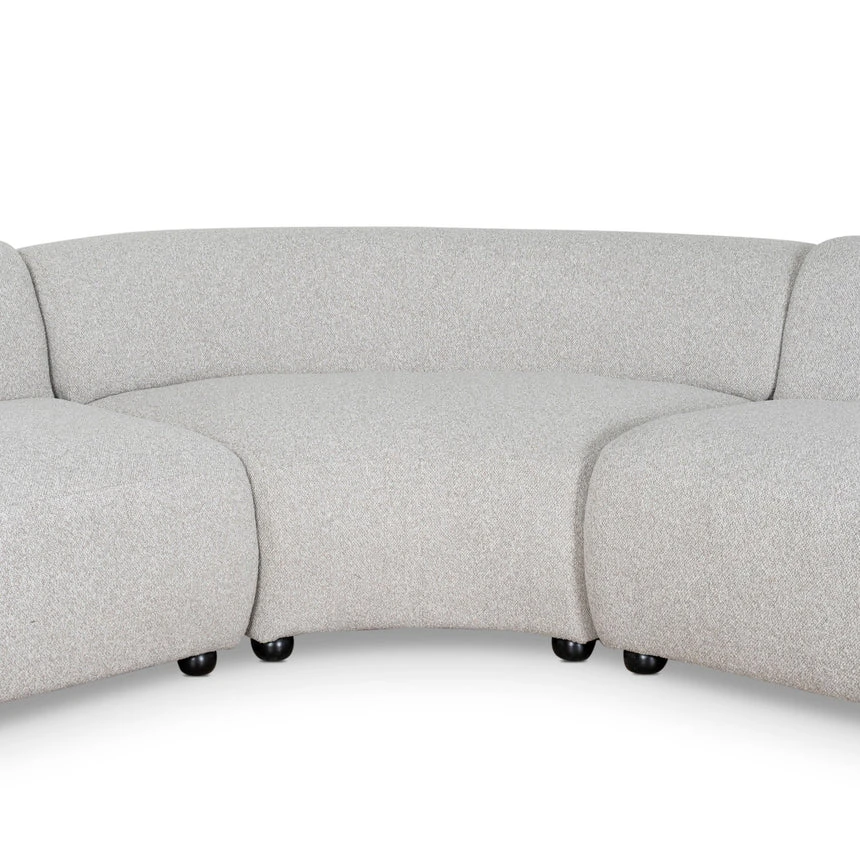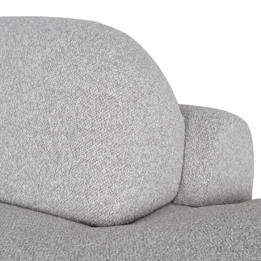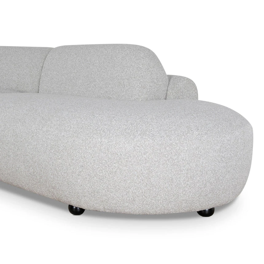 < Clay grey polyester upholstery Soft-medium seat firmness Pinewood frame construction Web and spring suspension Rubberwood legs Foam filling Flowing asymmetrical shape Spacious corner configuration Weight Capacity: 300 kg Minor Assembly Required