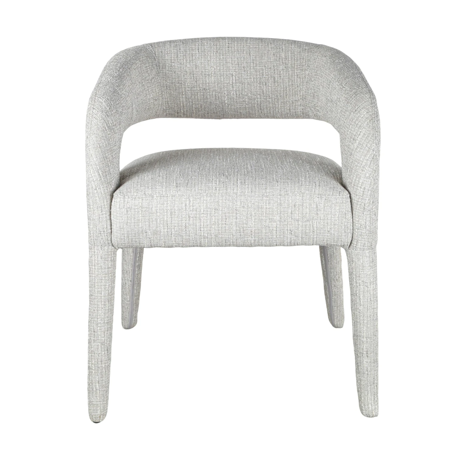 Chrome grey polyester upholstery Metal frame and legs Foam filling Soft-medium seat firmness Tapered legs Minimalist cutout back Wraparound backrest Weight Capacity: 200 kg Product comes fully assembled