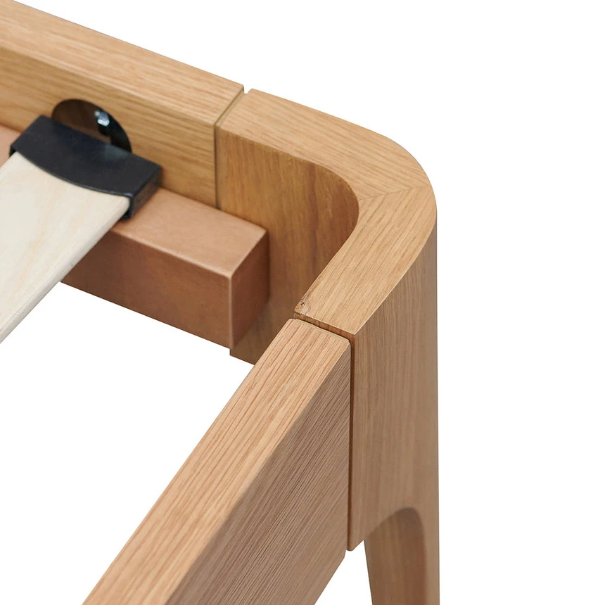 Bed frame is made of engineered wood with veneer 4x solid wood legs with floor protectors Headboard designed with an elongated curvature Bed frame slats equipped with strong center support Distributed weight capacity of 180kg Product is flat pack and requires two person assembly