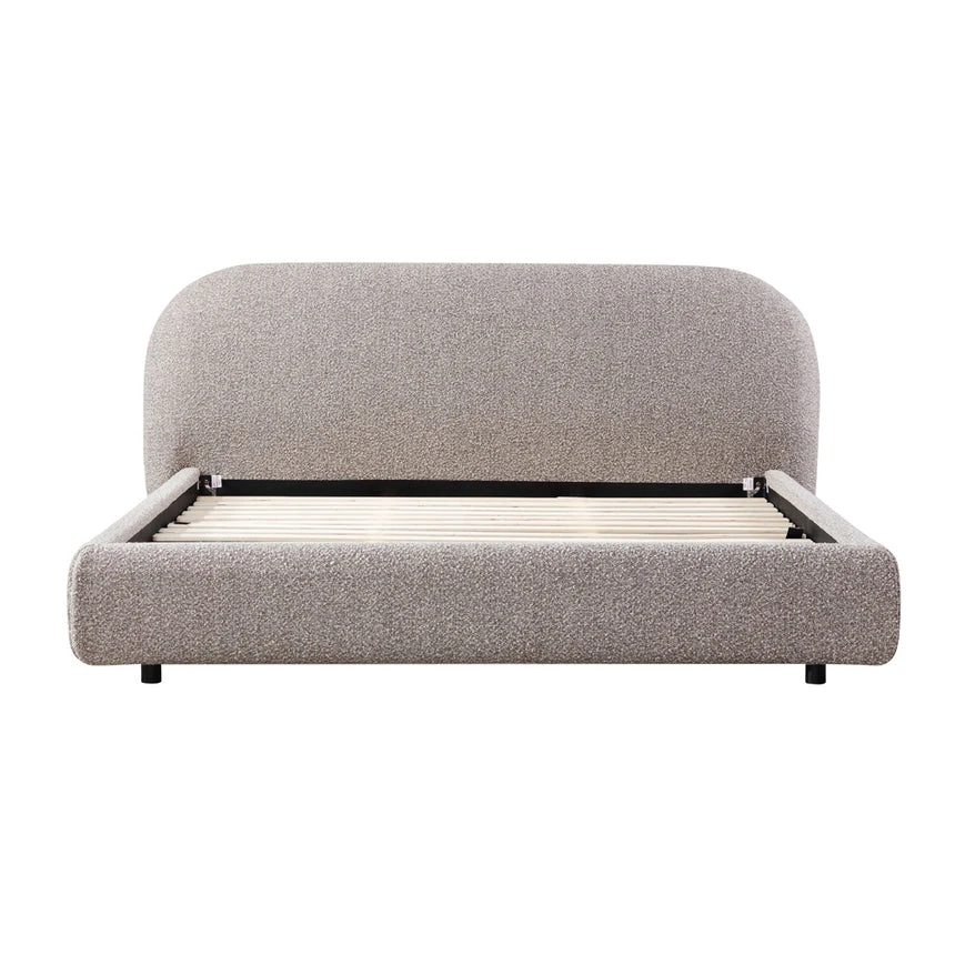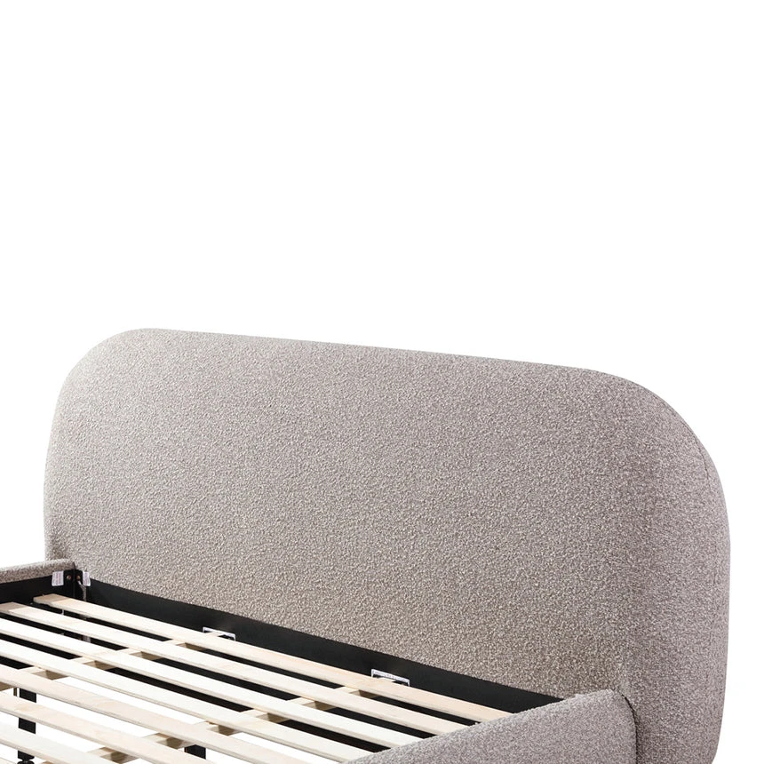 Upholstered in a 100% polyester sand Boucle finish Frame made of engineered wood Thick plush headboard with round corners High-density foam inserts 4x round matte black legs with floor protectors Sturdy bed frame slats equipped with strong center support rails 300kg weight capacity Suitable for commercial use Product comes flat pack and requires two-person assembly with electric drill