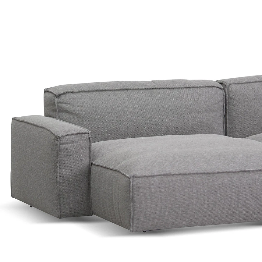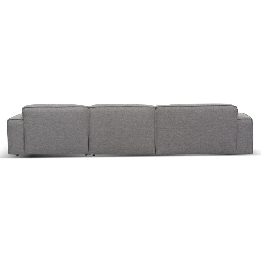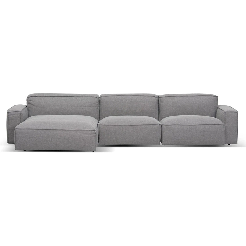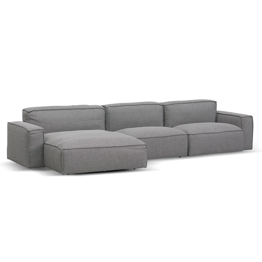 91% polyester and 9% acrylic fabric upholstery Plywood and solid wood frame Cushioned seats with square arms 3-seater left chaise design Anti-skid plastic legs with floor protectors Web-spring suspension Foam and fiber filling Suitable for commercial use 360kg weight capacity Product is fully assembled