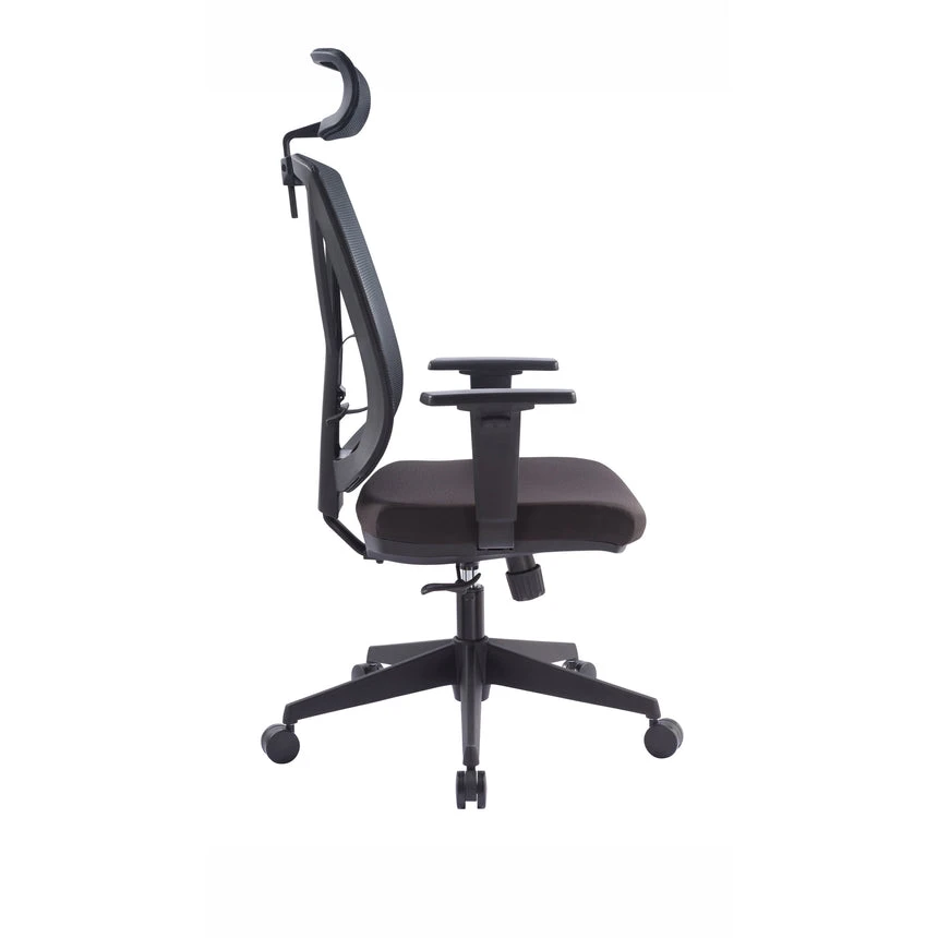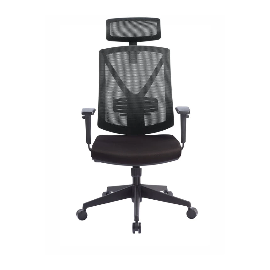 640mm Black Nylon Base Mesh back and fabric seat Height Adjustable Lumbar and Headrest Simple Synchro Mechanism (one locking position) 50R PA Black Castors and Flipped Arms 120kg weight limit Product comes flat pack and requires two person assembly