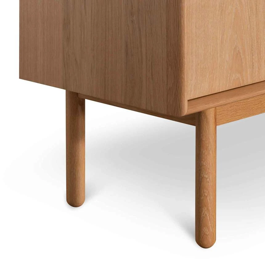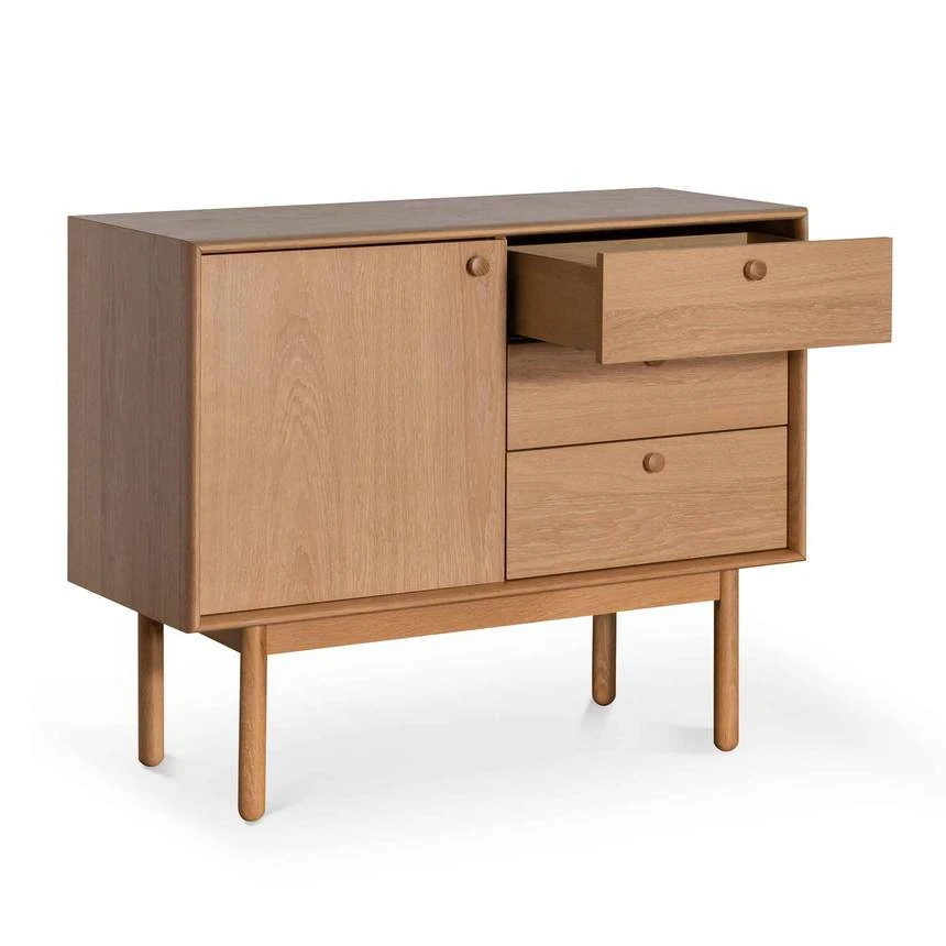 Constructed from solid American white oak and American white oak veneer Softened edges with rounded legs in an all-natural finish Round wooden drawer knobs Added sideboard skirt in a matching natural finish Features 3x drawers and 1x cupboard with concealed shelves Minor assembly required to attach legs to base
