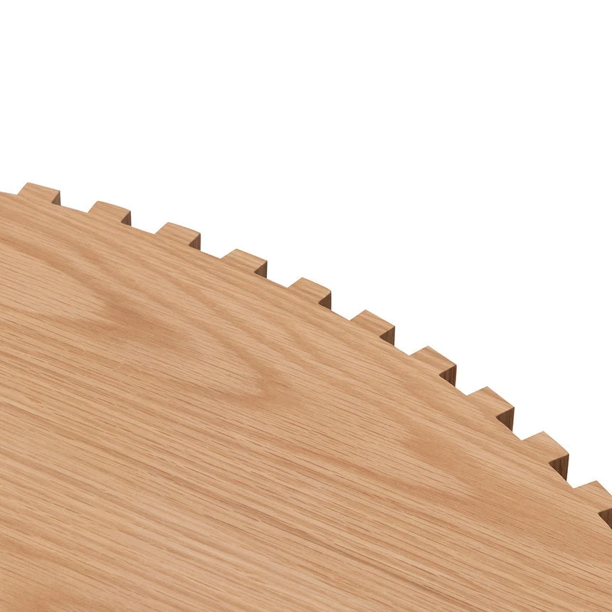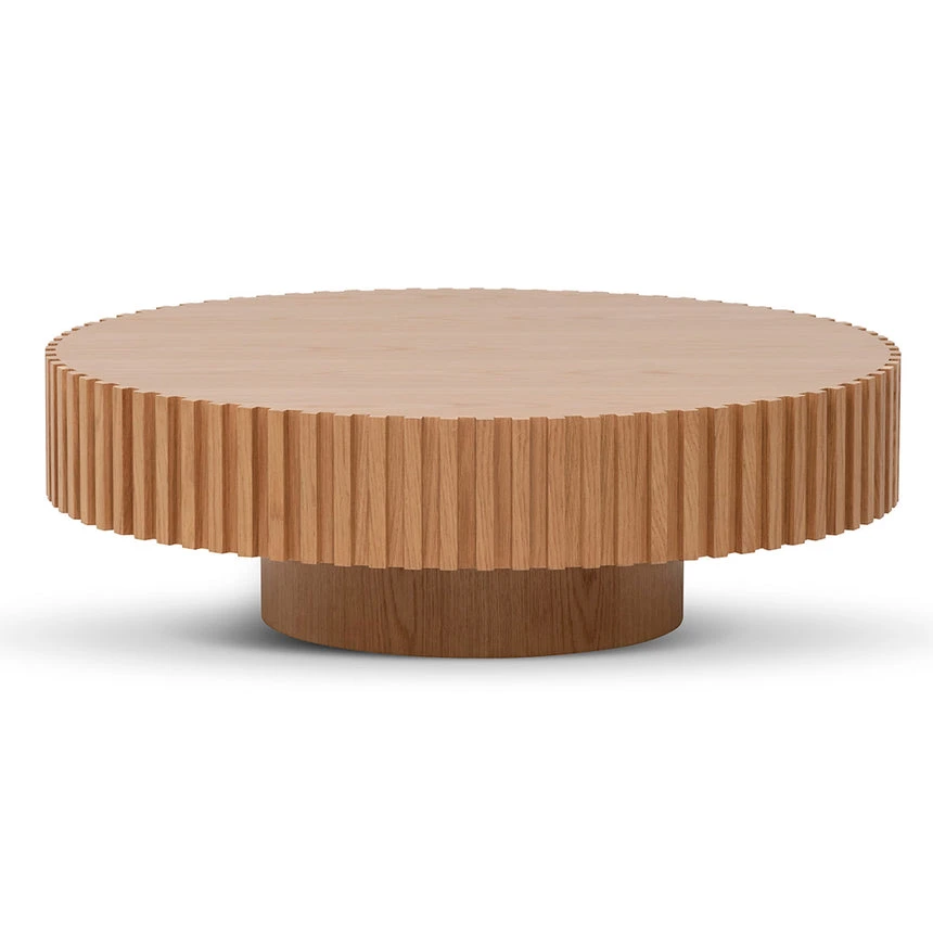 Engineered wood and natural veneer Includes E1 standard panelling Reeded wood design with deep wood textures throughout 20cm tabletop thickness with 40cm base diameter Minor assembly required to attach the base to tabletop