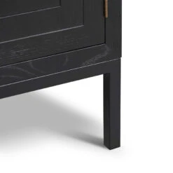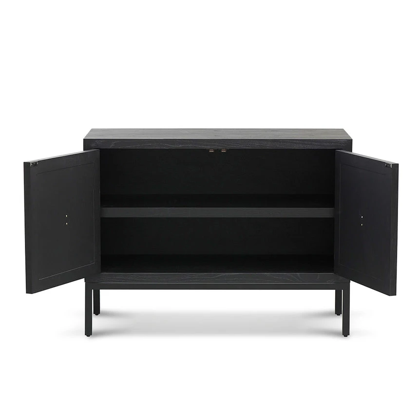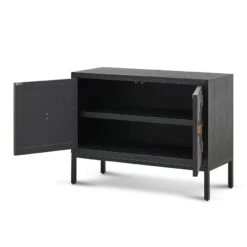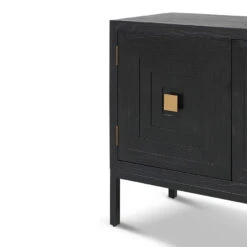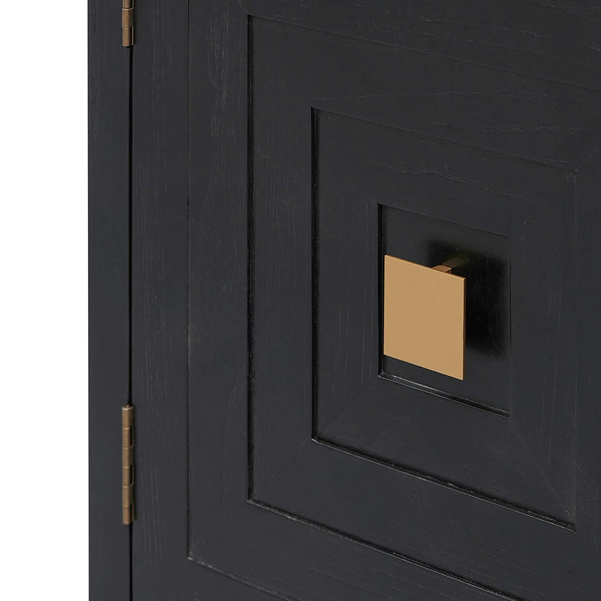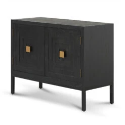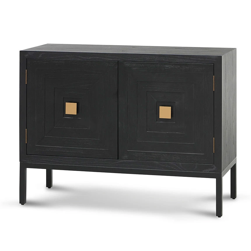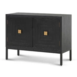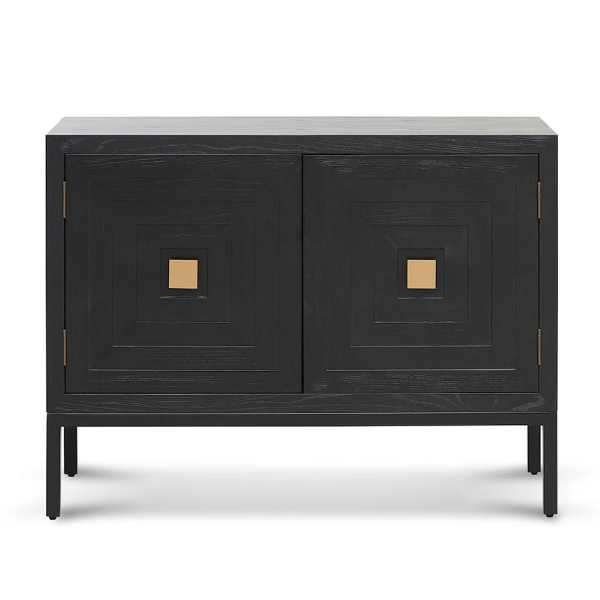 This striking sideboard unit boasts a sturdy elm wood frame and veneer construction, finished in bold powder black. Featuring 2 spacious shelves for storage and 2 stylish doors adorned with gold square handles, this unit is both functional and visually appealing. The pull-to-open doors reveal striking square patterns, adding a touch of elegance to any room. Supported by compact legs with non-slip protectors, this unit can hold up to 100 kg on the top surface and 20 kg on each shelf. Best of all, this product comes fully assembled, making it a hassle-free addition to your home.
