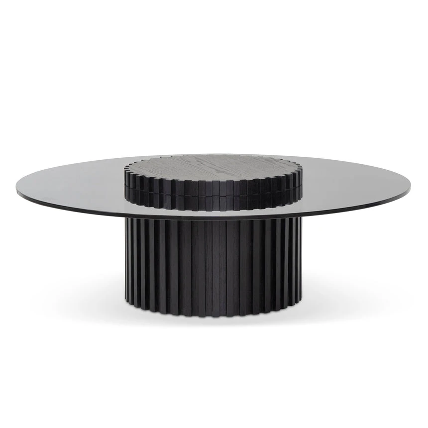 Black base with glass top Engineered Wood base with black veneer Slatted cog style design 30kg weight limit Product comes flat pack and requires two person assembly