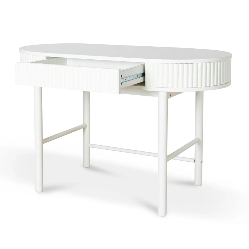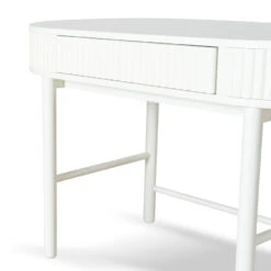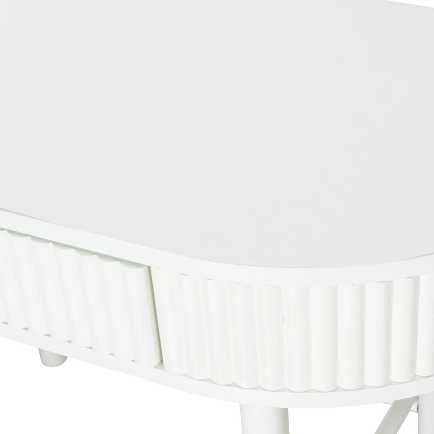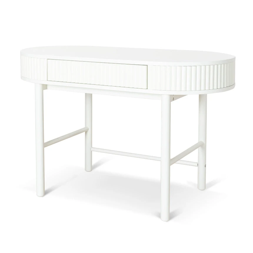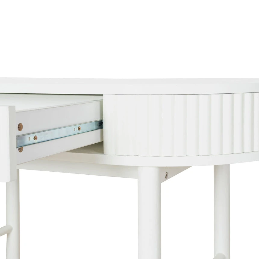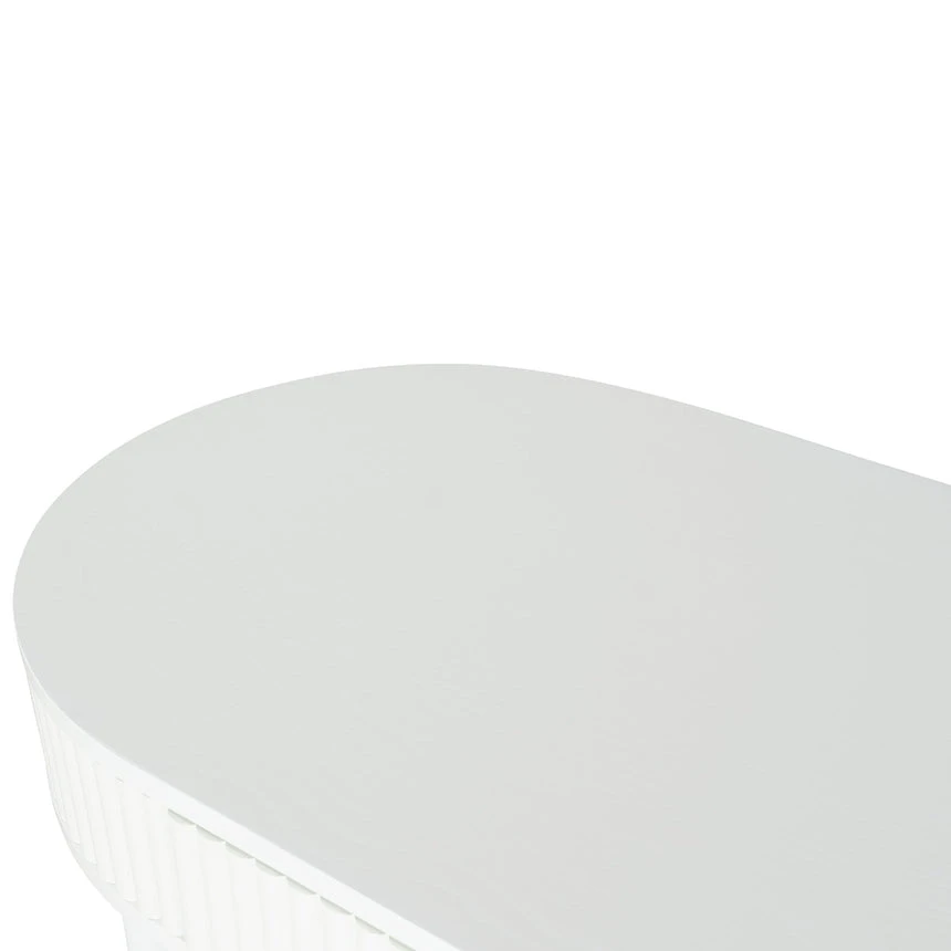 Engineered wood with natural oak veneer Solid natural wood legs NC painting Functional and aesthetic Contemporary rounded edges Pull-out drawer Ribbed textured detailing Weight Capacity: 80 kg Product is flat packed and requires two-person assembly Note: Please note that white tones may be affected by the lighting in the room.