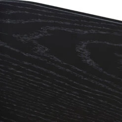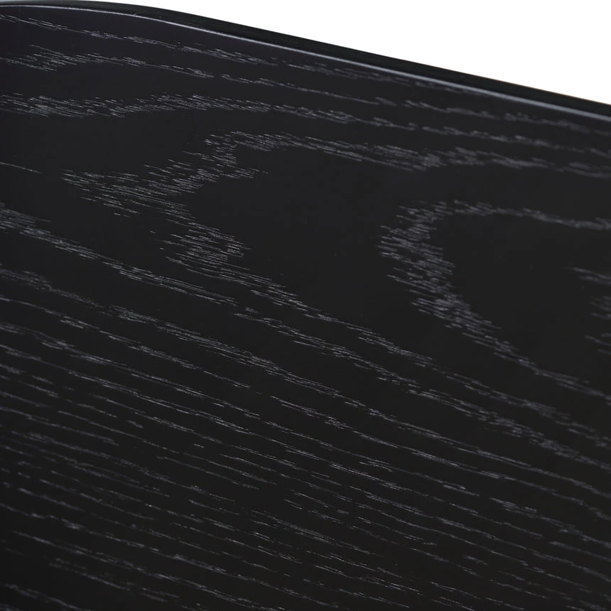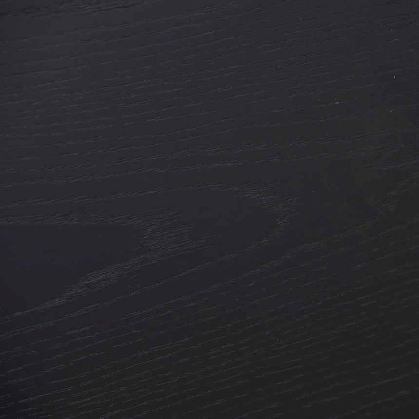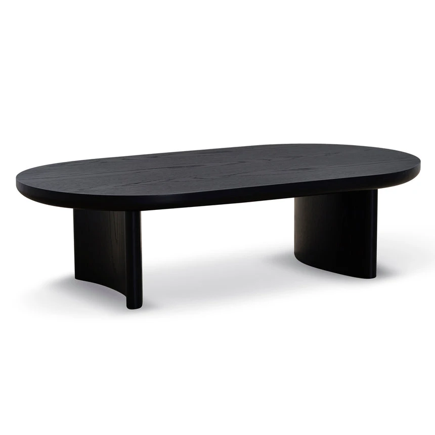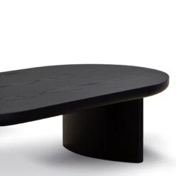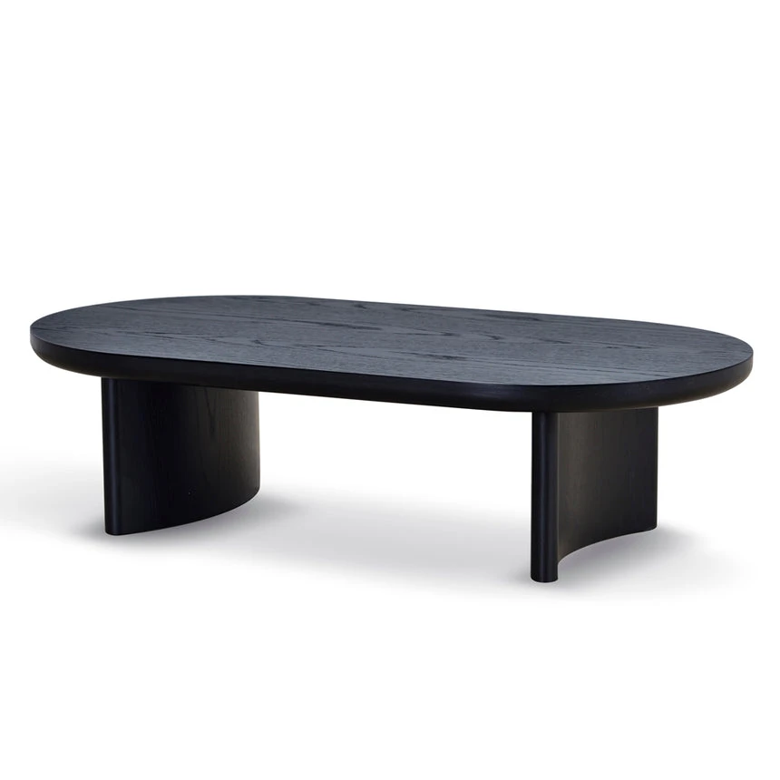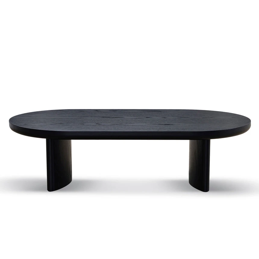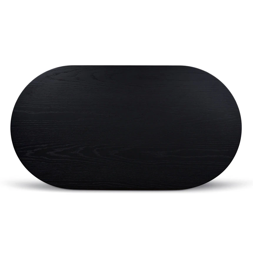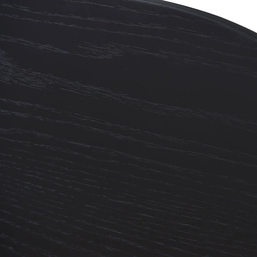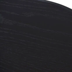 Engineered wood top and base with oak veneer Polyurethane paint coating Full black finish Oval-shaped tabletop Visible wood grain patterns Softly curved legs Minor assembly required