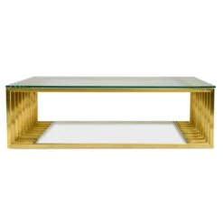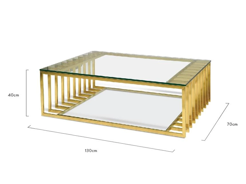 Features 2x rectangular clear tempered glass table top and lower shelf Strong stainless steel legs and flat frame in a brushed gold finish Intricate frame with repetitive elements creates a simple geometric interest Feet protectors included preventing slipping and scuffing Suction cups included to secure the table top and frame